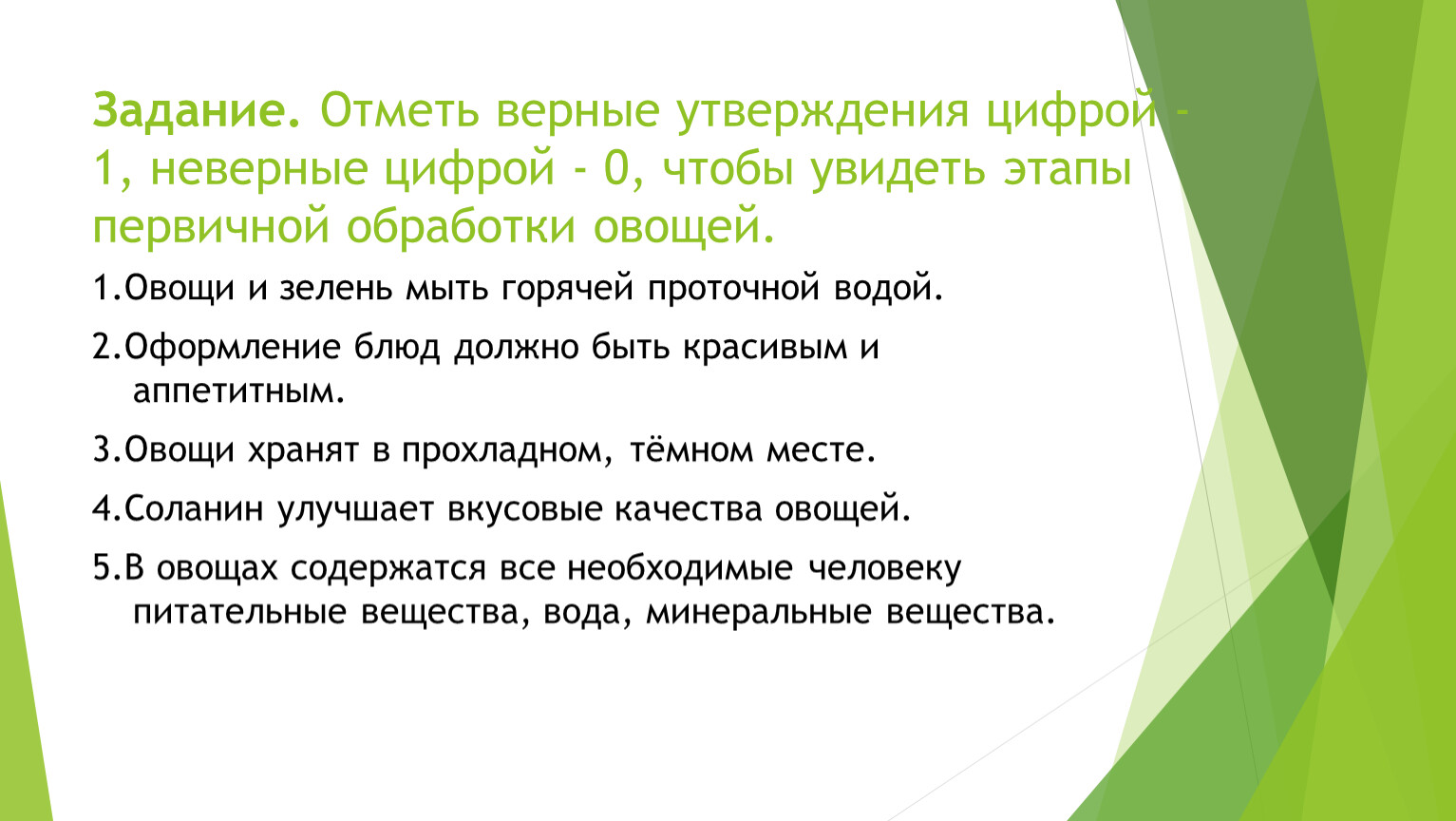 Задание. Отметь верные утверждения цифрой - 1, неверные цифрой - 0, чтобы увидеть этапы первичной обработки овощей.