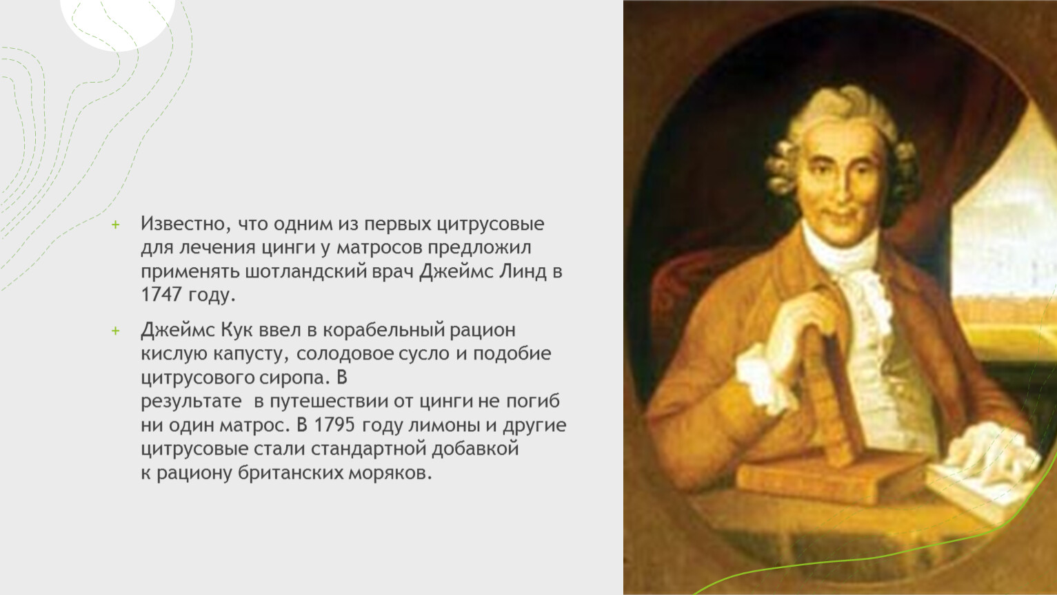 Известно, что одним из первых цитрусовые для лечения цинги у матросов предложил применять шотландский врач Джеймс Линд в 1747 году.