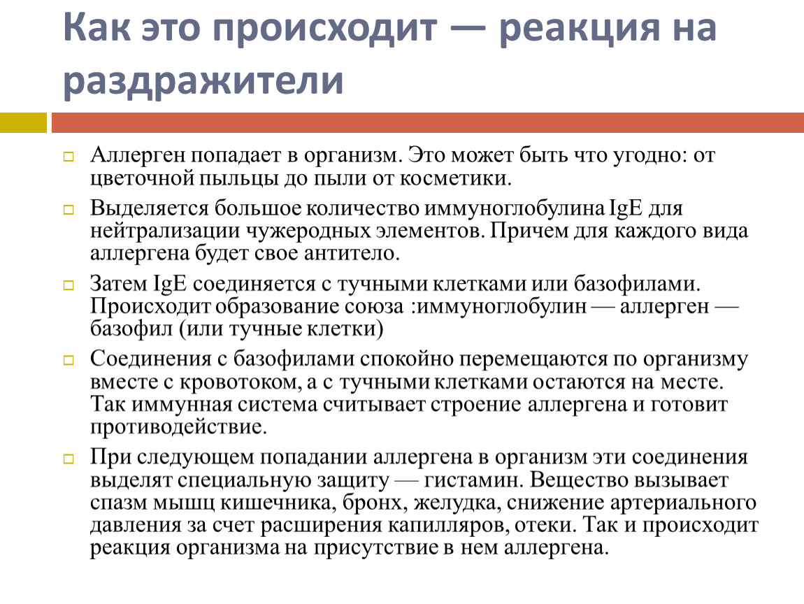 Аллерген попадает в организм. Это может быть что угодно: от цветочной пыльцы до пыли от косметики.