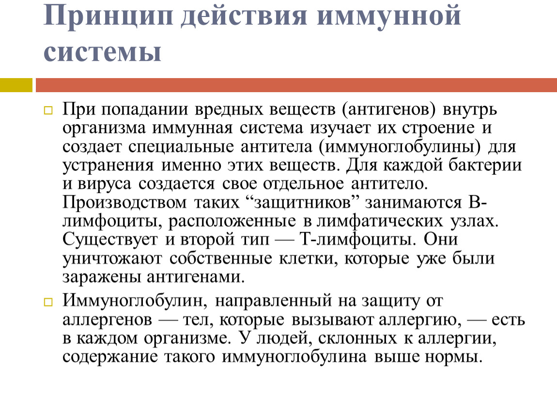 При попадании вредных веществ (антигенов) внутрь организма иммунная система изучает их строение и создает специальные антитела (иммуноглобулины) для устранения именно этих веществ. Для каждой бактерии и вируса создается свое отдельное антитело. Производством таких “защитников” занимаются В-лимфоциты, расположенные в лимфатических узлах. Существует и второй тип — Т-лимфоциты. Они уничтожают собственные клетки, которые уже были заражены антигенами.