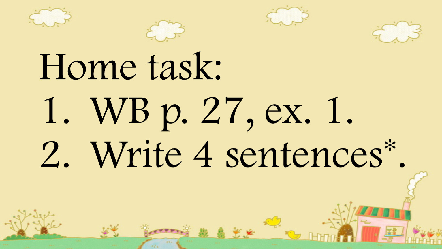 Home task: WB p. 27, ex. 1. Write 4 sentences*.