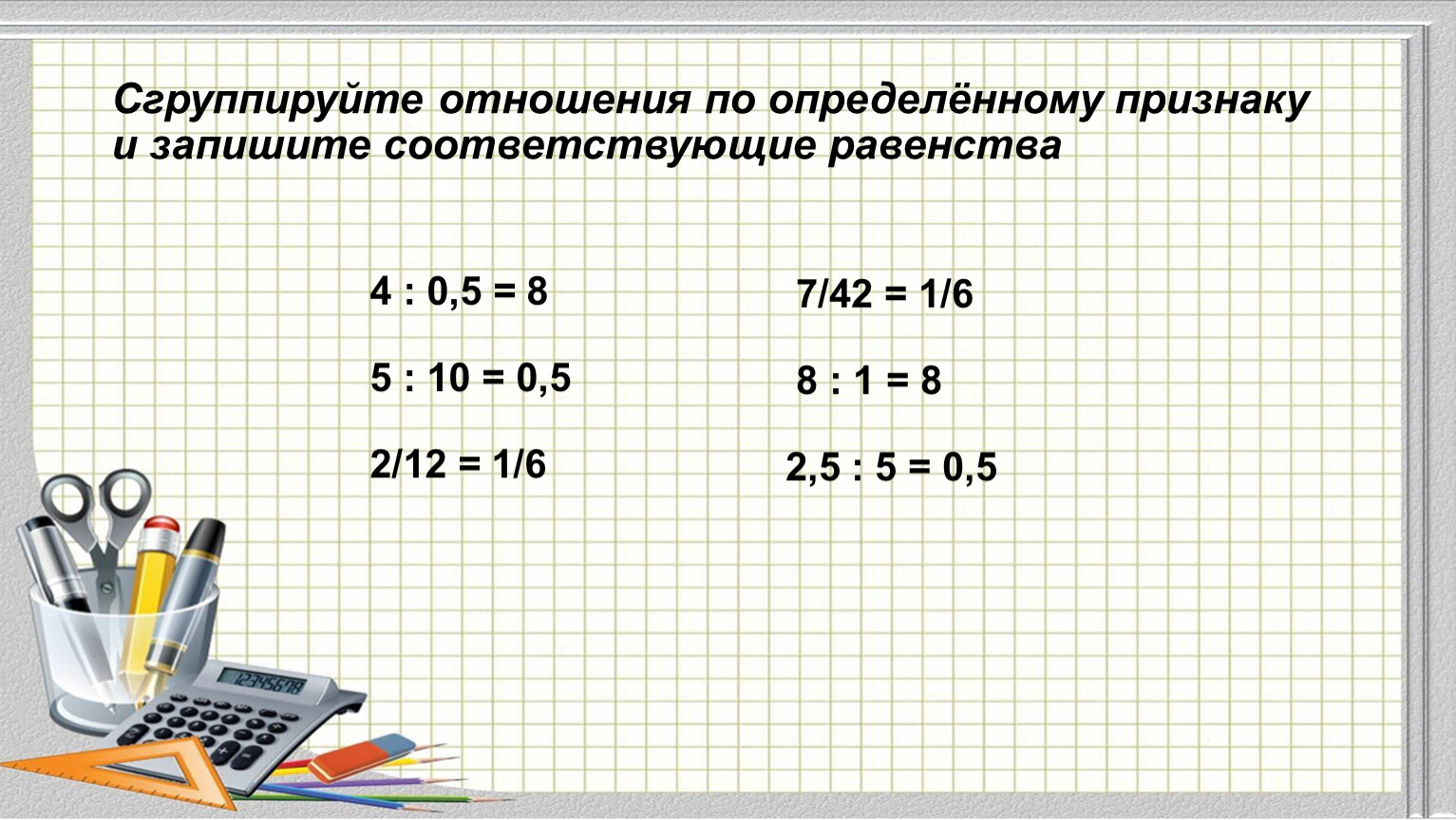 Сгруппируйте отношения по определённому признаку и запишите соответствующие равенства
