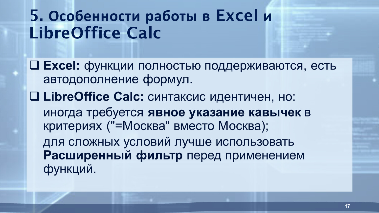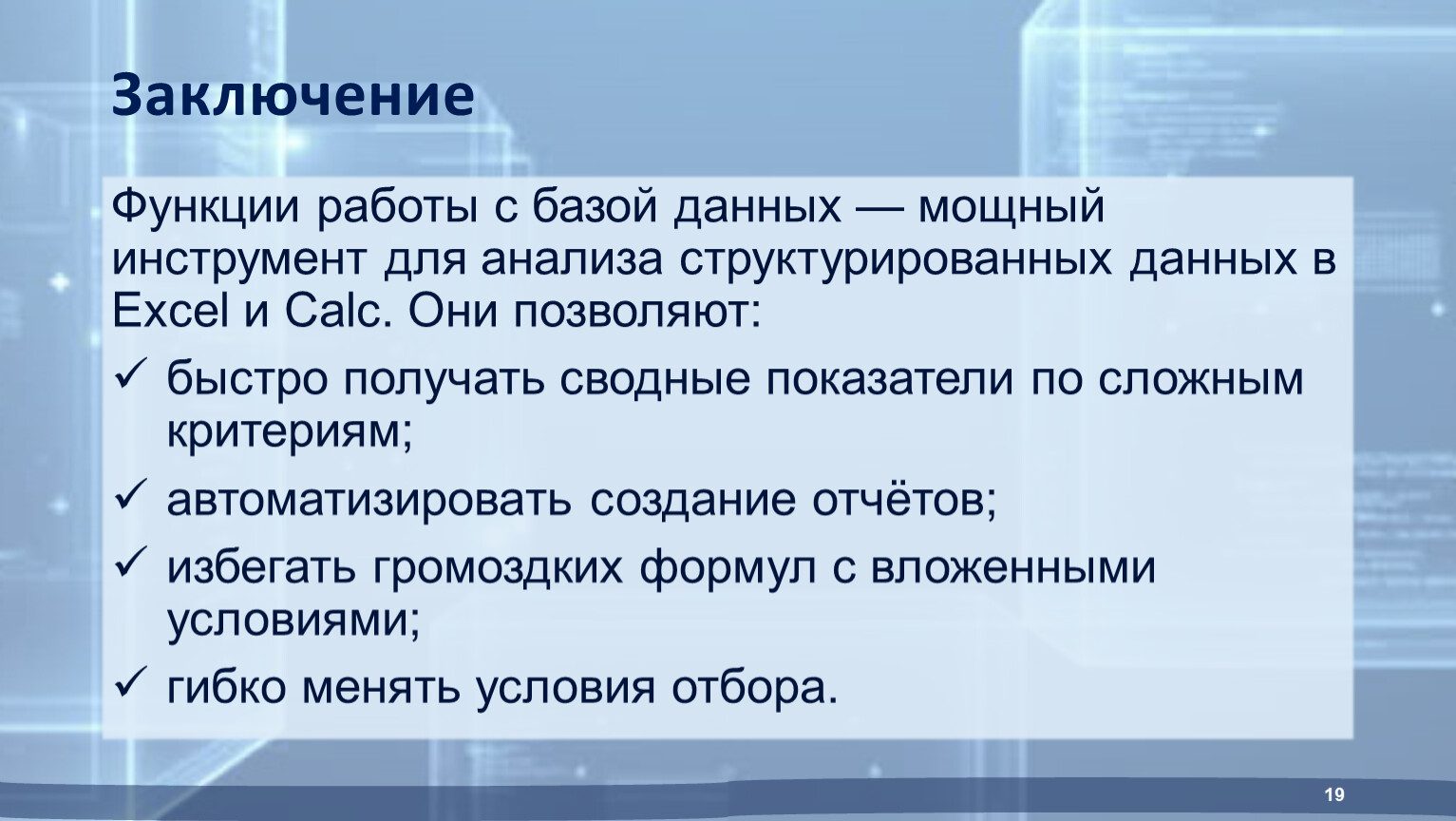 Функции работы с базой данных — мощный инструмент для анализа структурированных данных в Excel и Calc. Они позволяют: