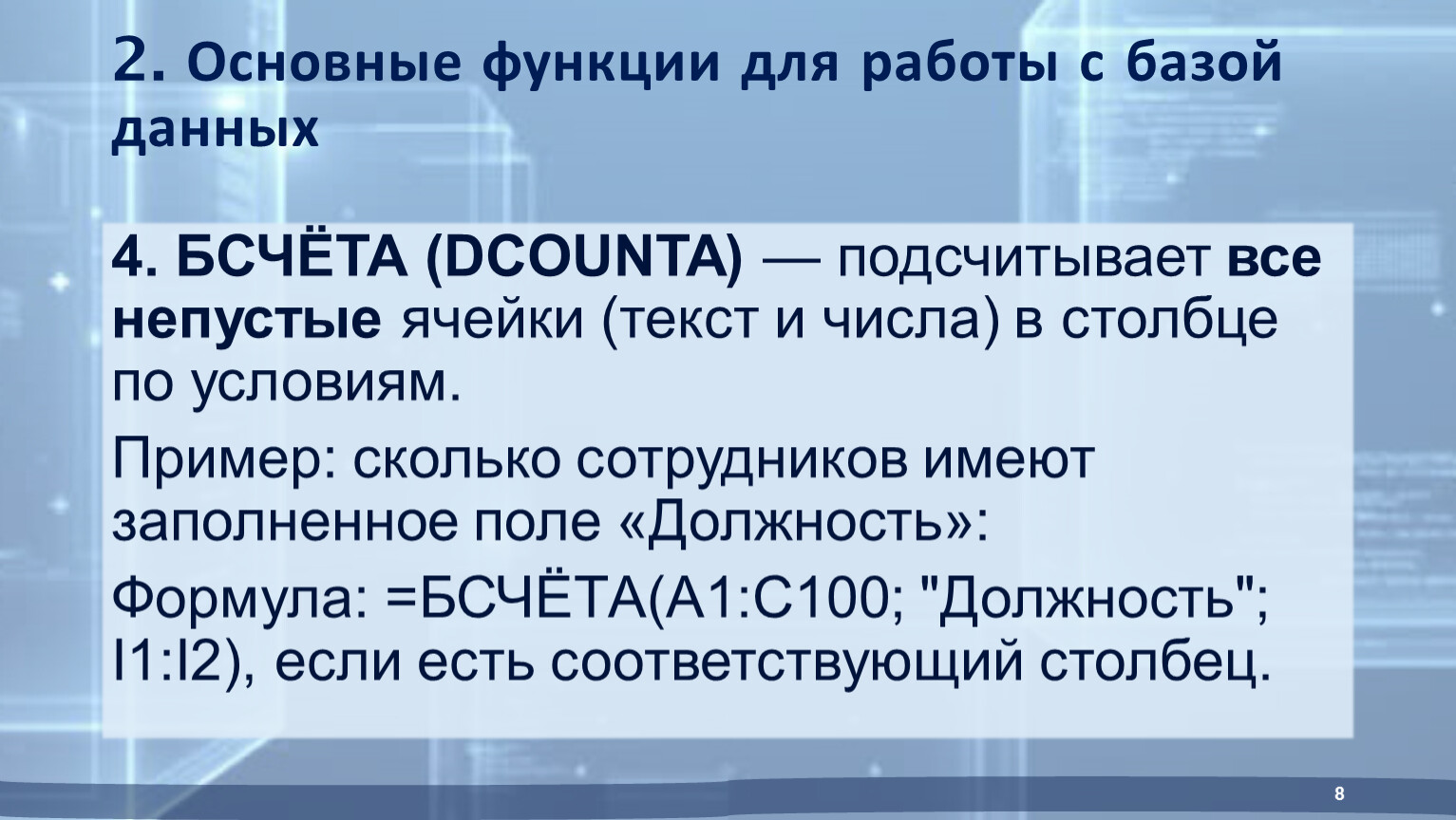 4. БСЧЁТА (DCOUNTA) — подсчитывает все непустые ячейки (текст и числа) в столбце по условиям.