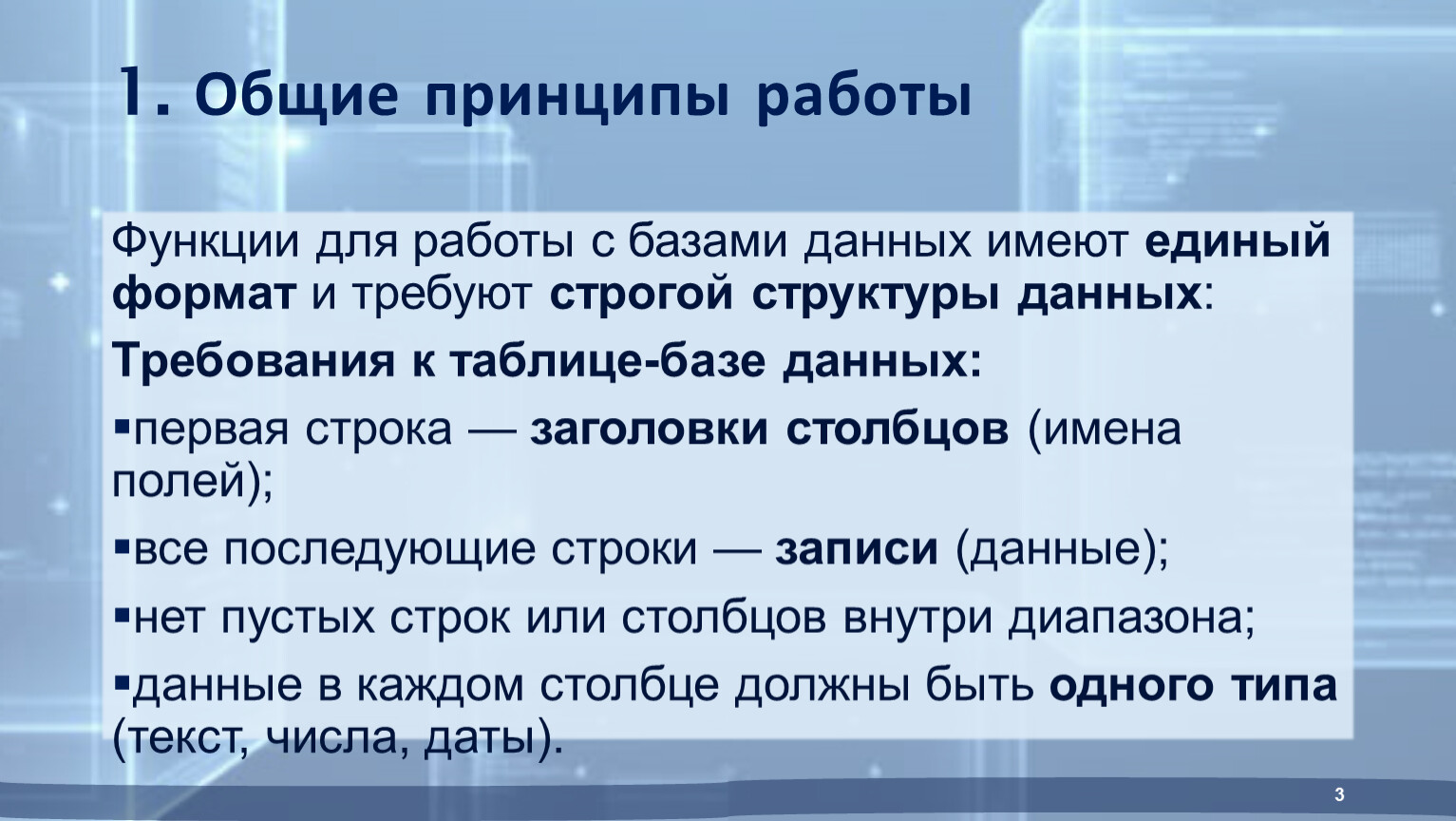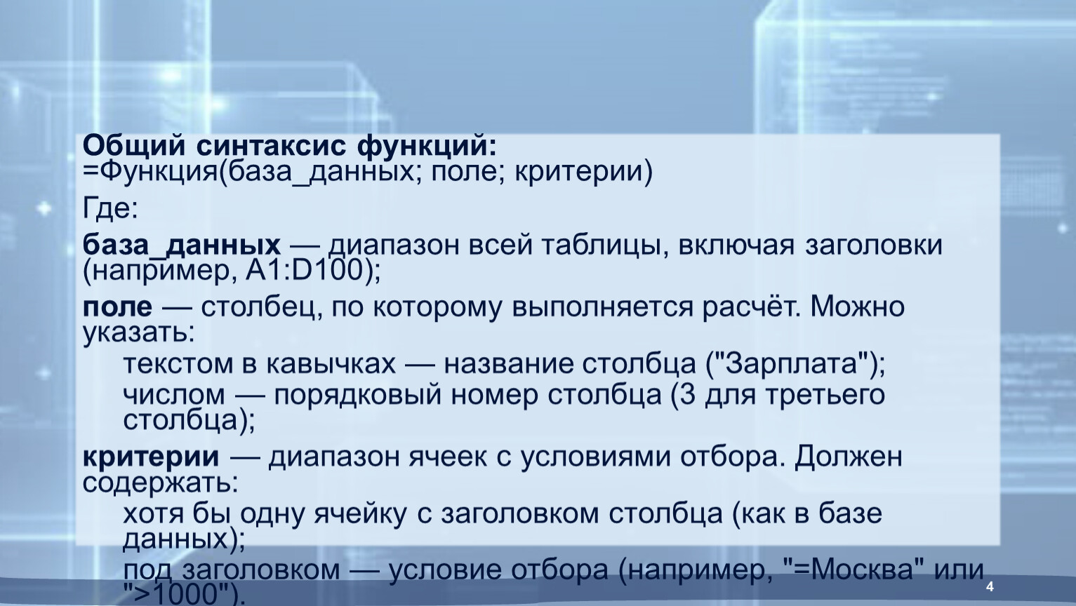 Общий синтаксис функций:=Функция(база_данных; поле; критерии)