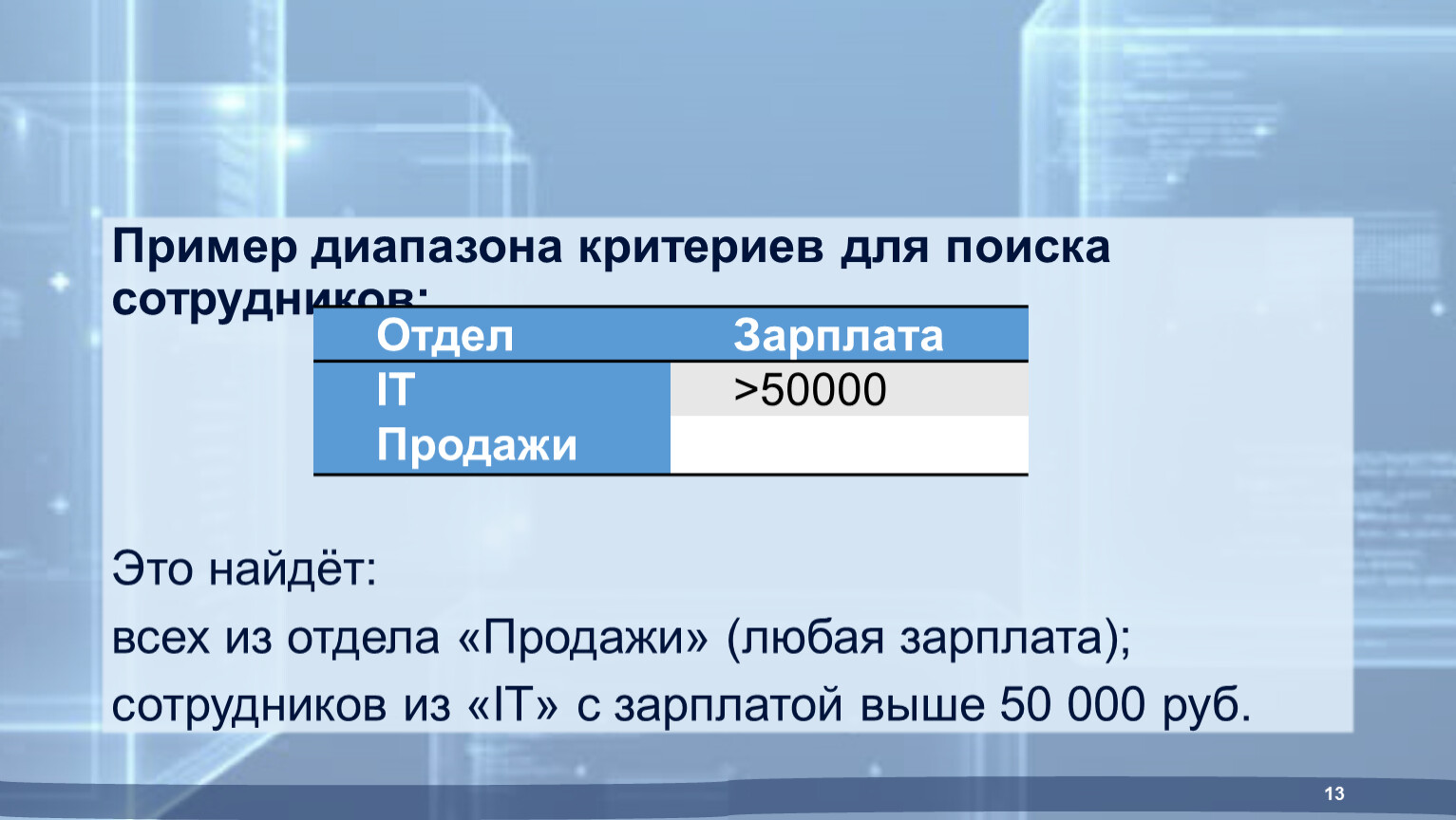 несколько условий в одной строке — И (например, «Отдел=Бухгалтерия» И «Зарплата>40000»);