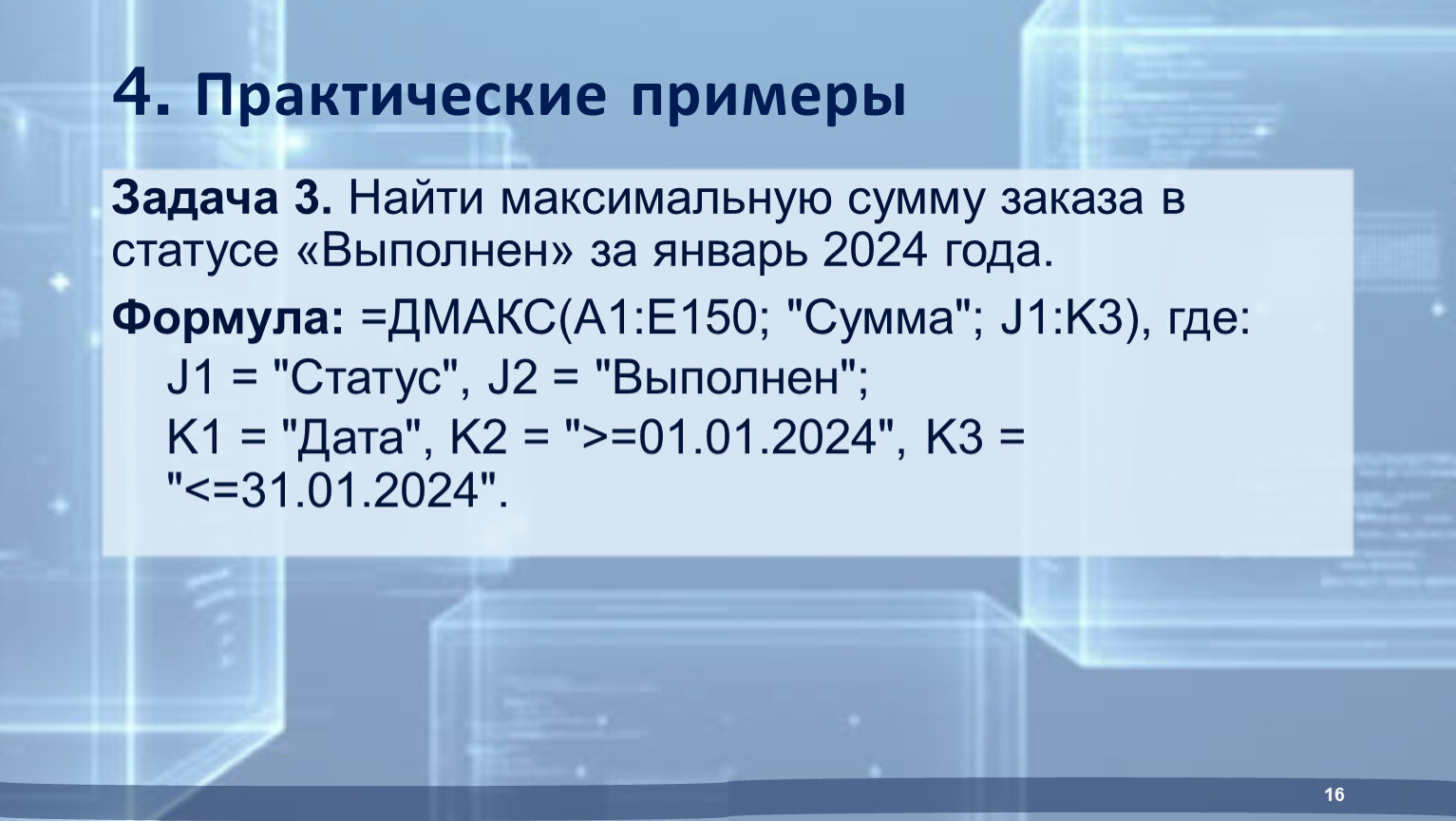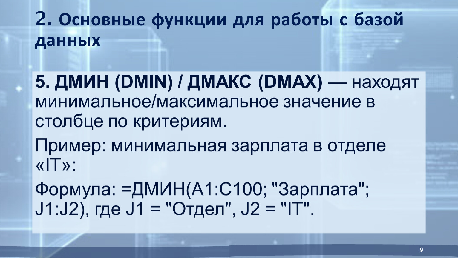 5. ДМИН (DMIN) / ДМАКС (DMAX) — находят минимальное/максимальное значение в столбце по критериям.