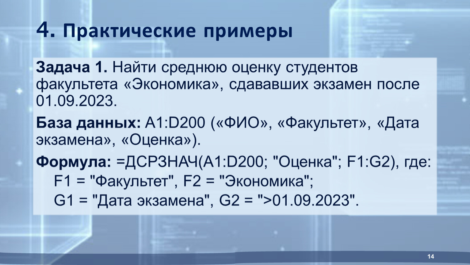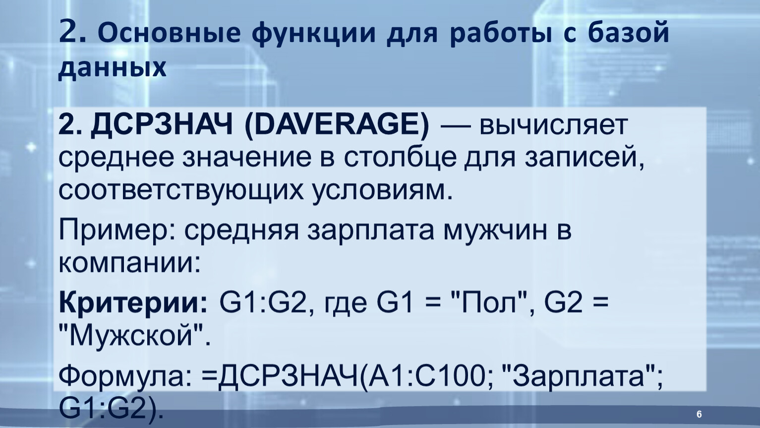 2. ДСРЗНАЧ (DAVERAGE) — вычисляет среднее значение в столбце для записей, соответствующих условиям.