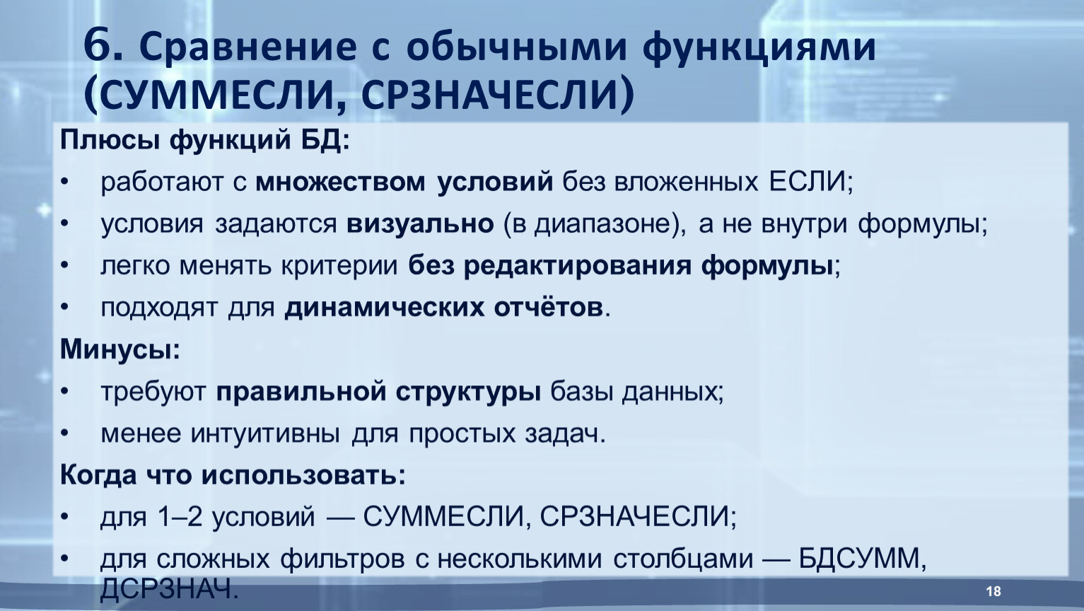 6. Сравнение с обычными функциями (СУММЕСЛИ, СРЗНАЧЕСЛИ)