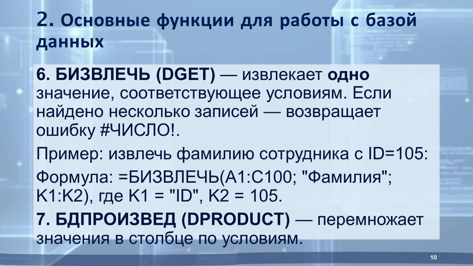 6. БИЗВЛЕЧЬ (DGET) — извлекает одно значение, соответствующее условиям. Если найдено несколько записей — возвращает ошибку #ЧИСЛО!.