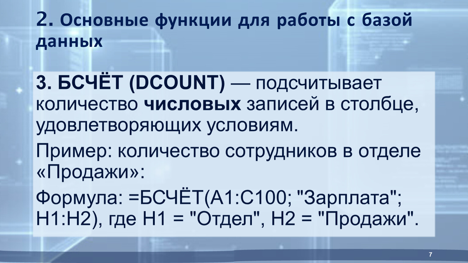 3. БСЧЁТ (DCOUNT) — подсчитывает количество числовых записей в столбце, удовлетворяющих условиям.