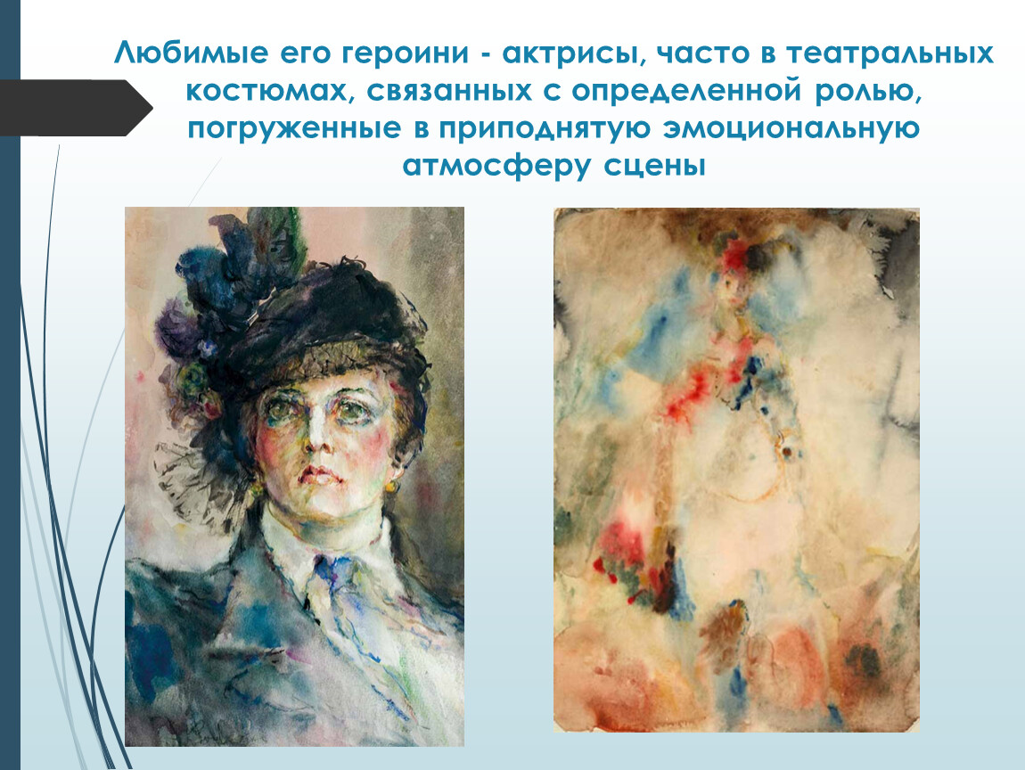 Любимые его героини - актрисы, часто в театральных костюмах, связанных с определенной ролью, погруженные в приподнятую эмоциональную атмосферу сцены