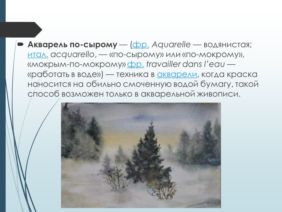 Акварель по-сырому — (фр. Aquarelle — водянистая; итал. acquarello, — «по-сырому» или «по-мокрому», «мокрым-по-мокрому» фр. travailler dans l’eau — «работать в воде») — техника в акварели, когда краска наносится на обильно смоченную водой бумагу, такой способ возможен только в акварельной живописи.