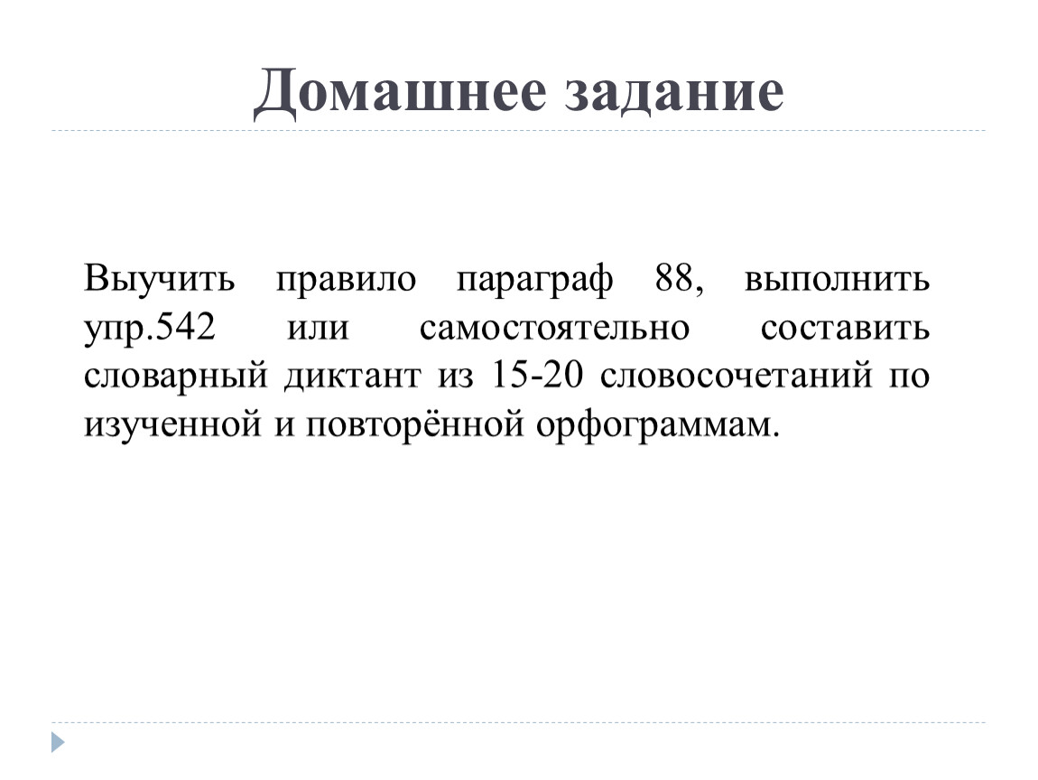 Выучить правило параграф 88, выполнить упр.542 или самостоятельно составить словарный диктант из 15-20 словосочетаний по изученной и повторённой орфограммам.