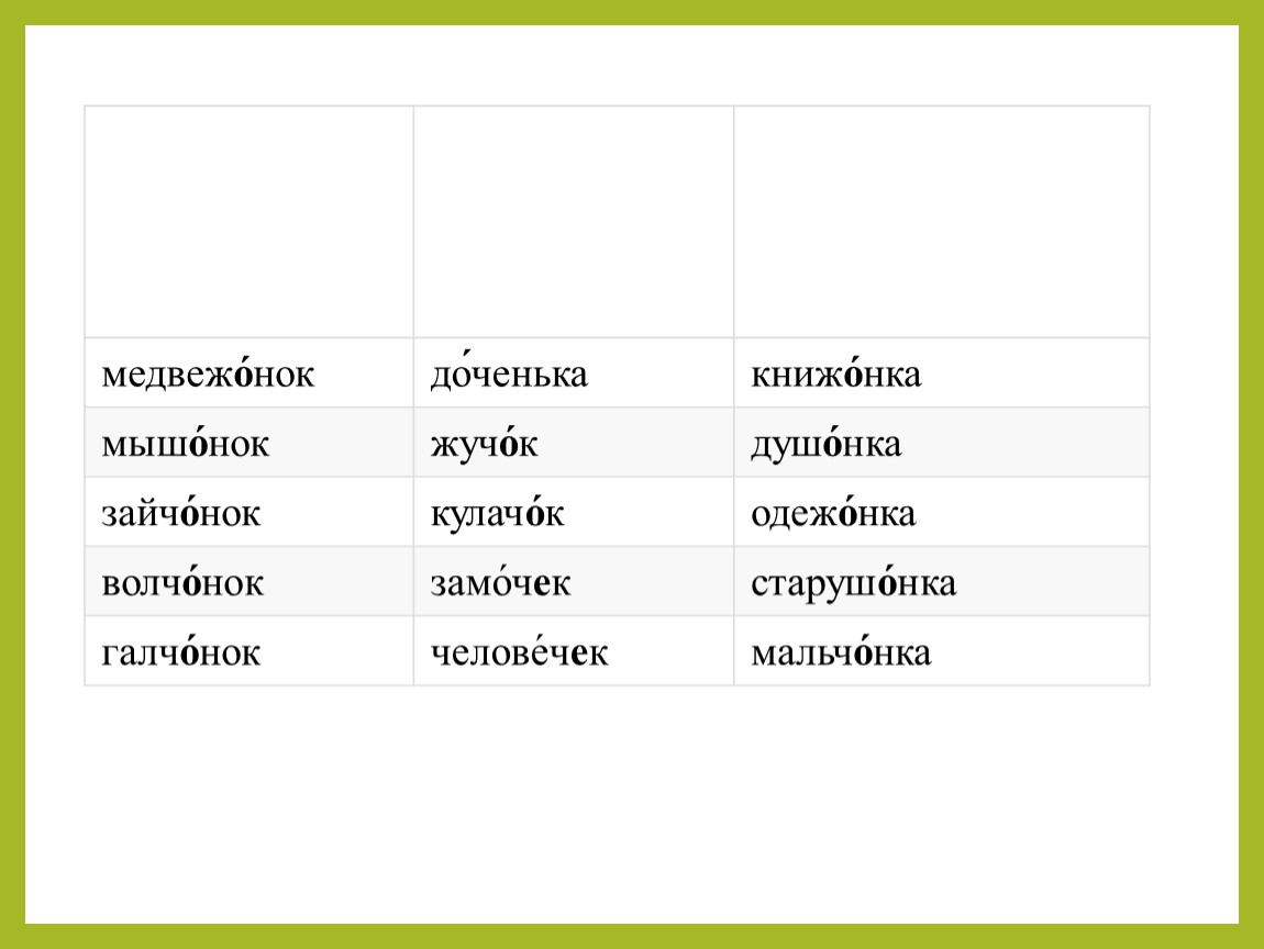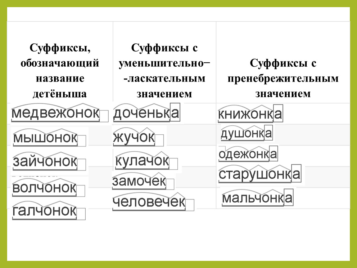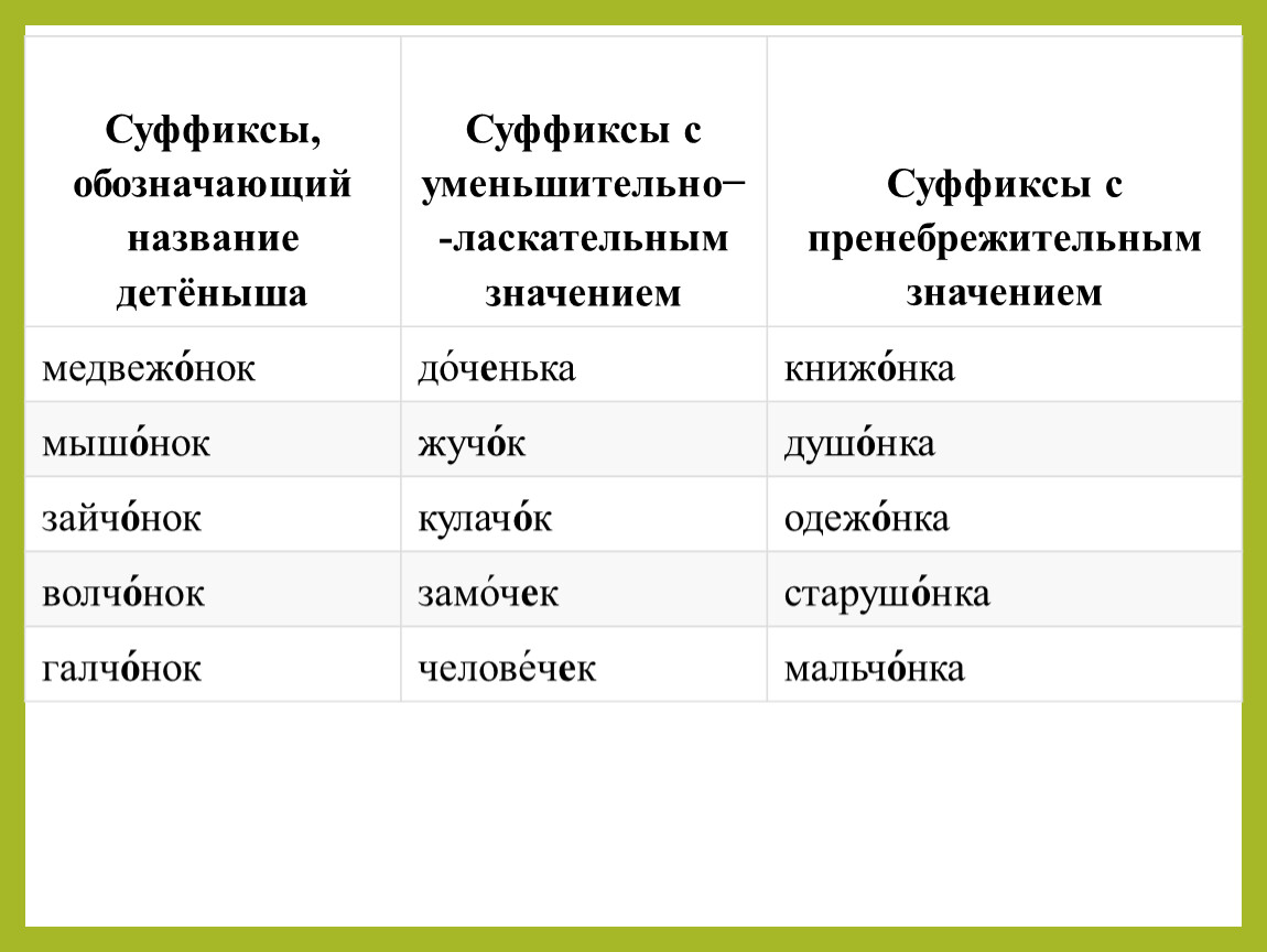 Суффиксы, обозначающий название детёныша | Суффиксы с уменьшительно−-ласкательным значением | Суффиксы с пренебрежительным значением |