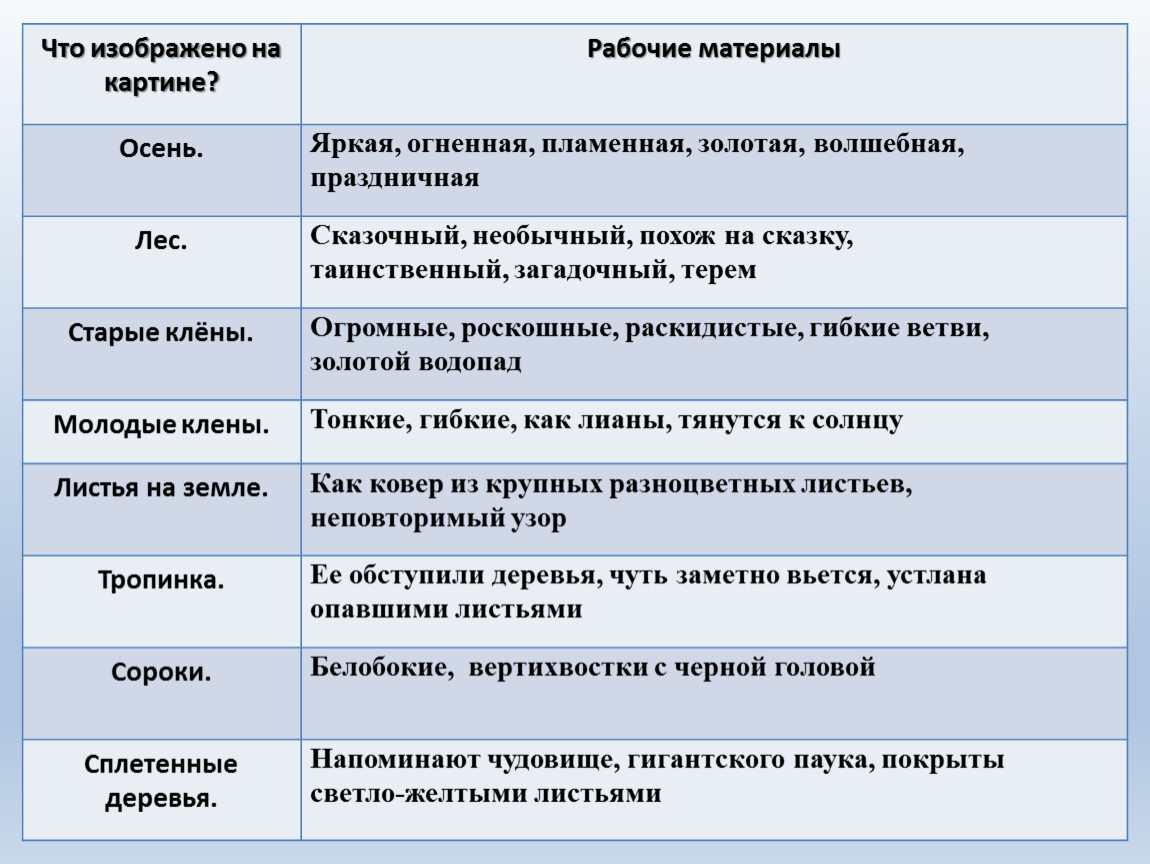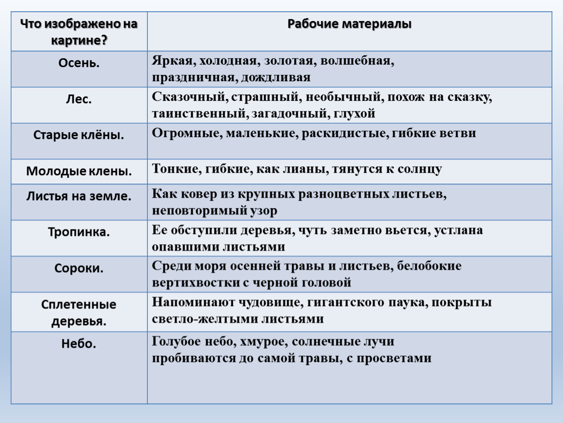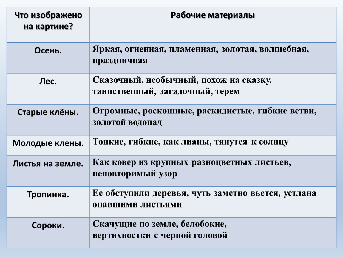 Яркими красками изобразил художник осеннюю лесную поляну. Вокруг царит тишина. Лишь на узкой тропинке болтают о чём-то сороки.