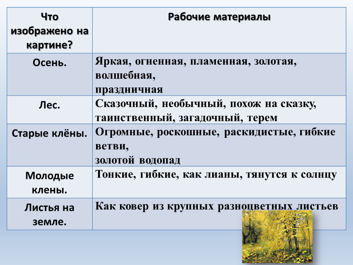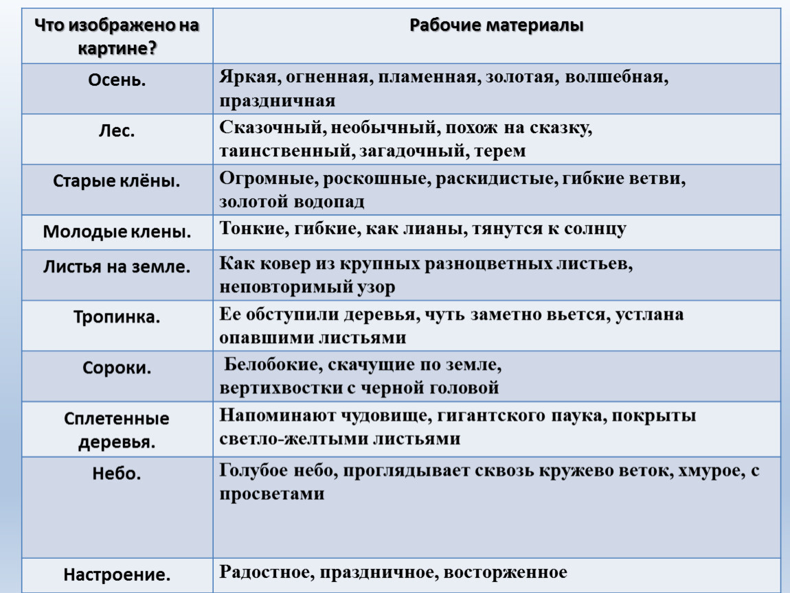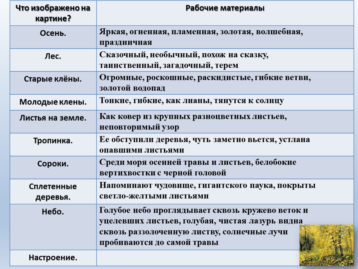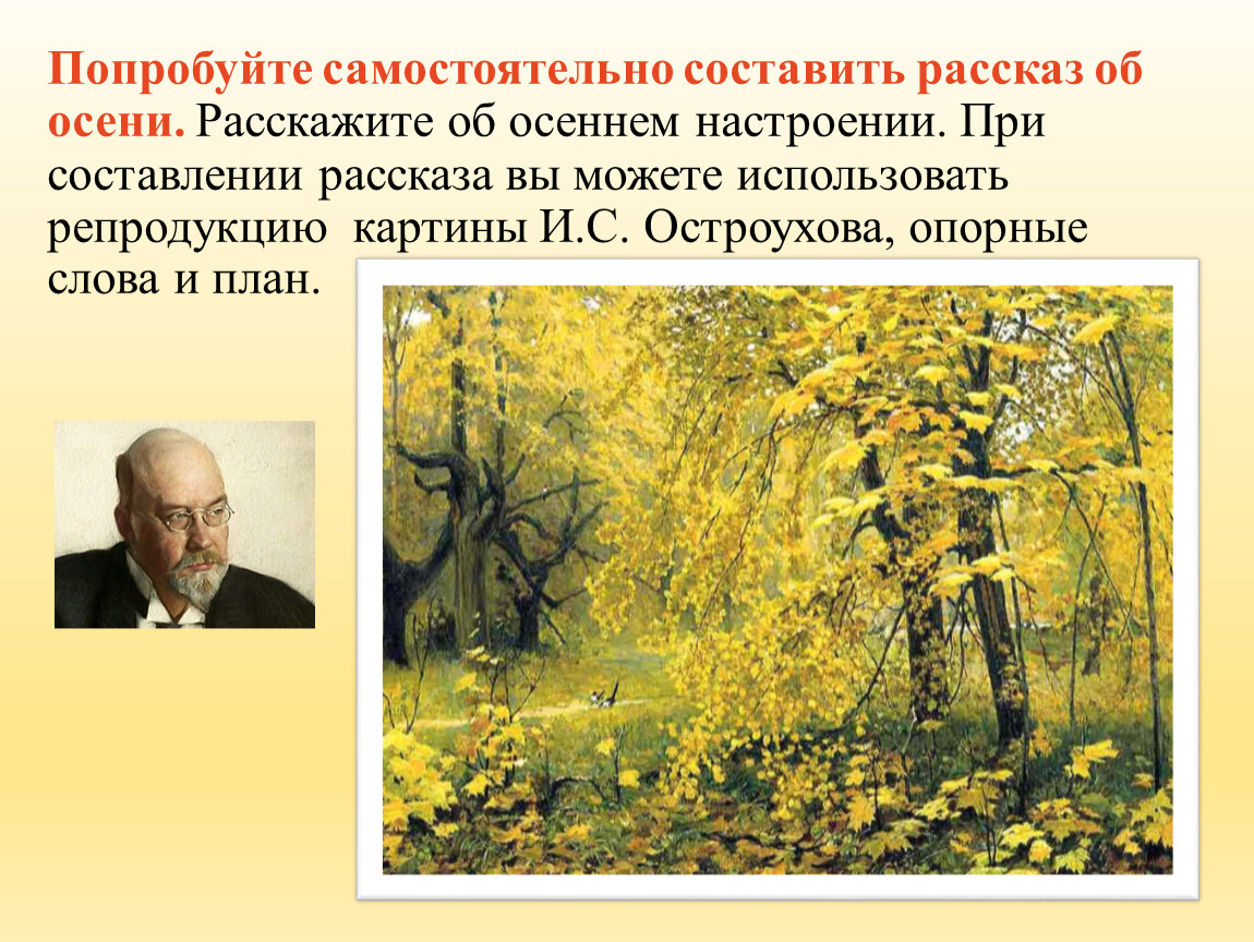 Попробуйте самостоятельно составить рассказ об осени. Расскажите об осеннем настроении. При составлении рассказа вы можете использовать репродукцию картины И.С. Остроухова, опорные слова и план.