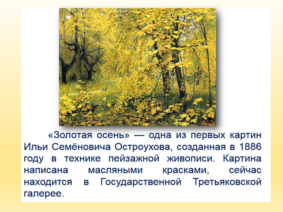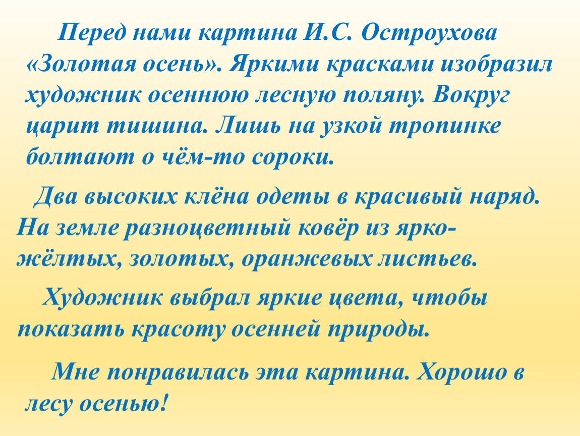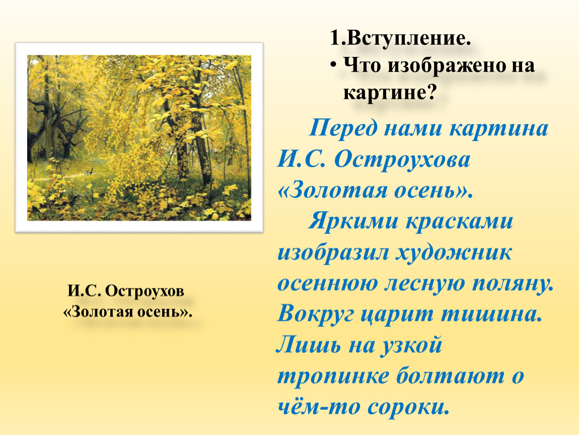 Перед нами картина И.С. Остроухова «Золотая осень». Яркими красками изобразил художник осеннюю лесную поляну. Вокруг царит тишина. Лишь на узкой тропинке болтают о чём-то сороки.