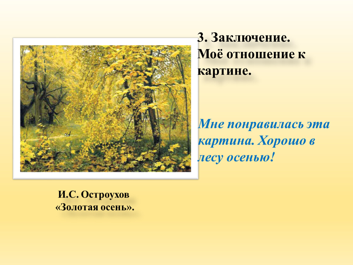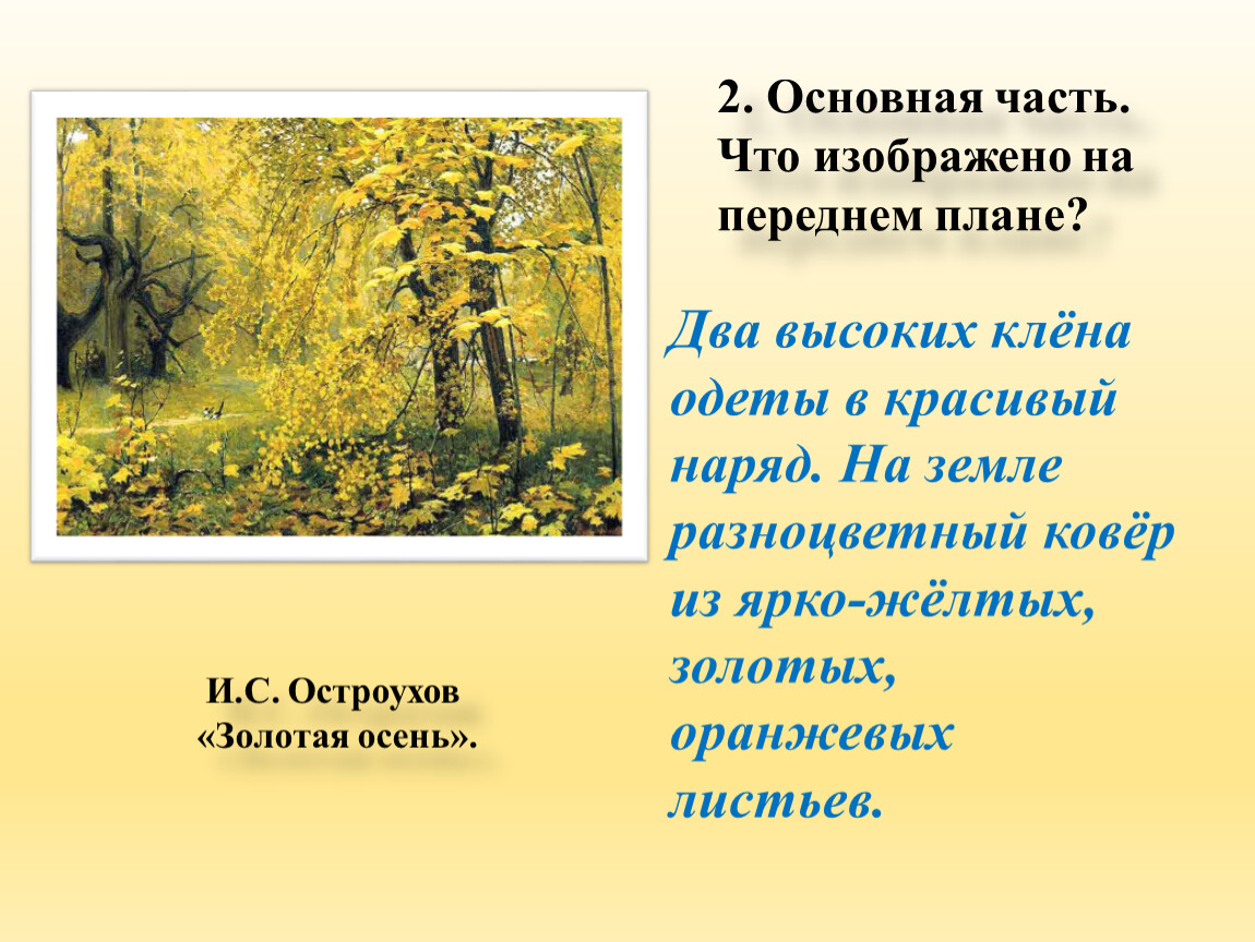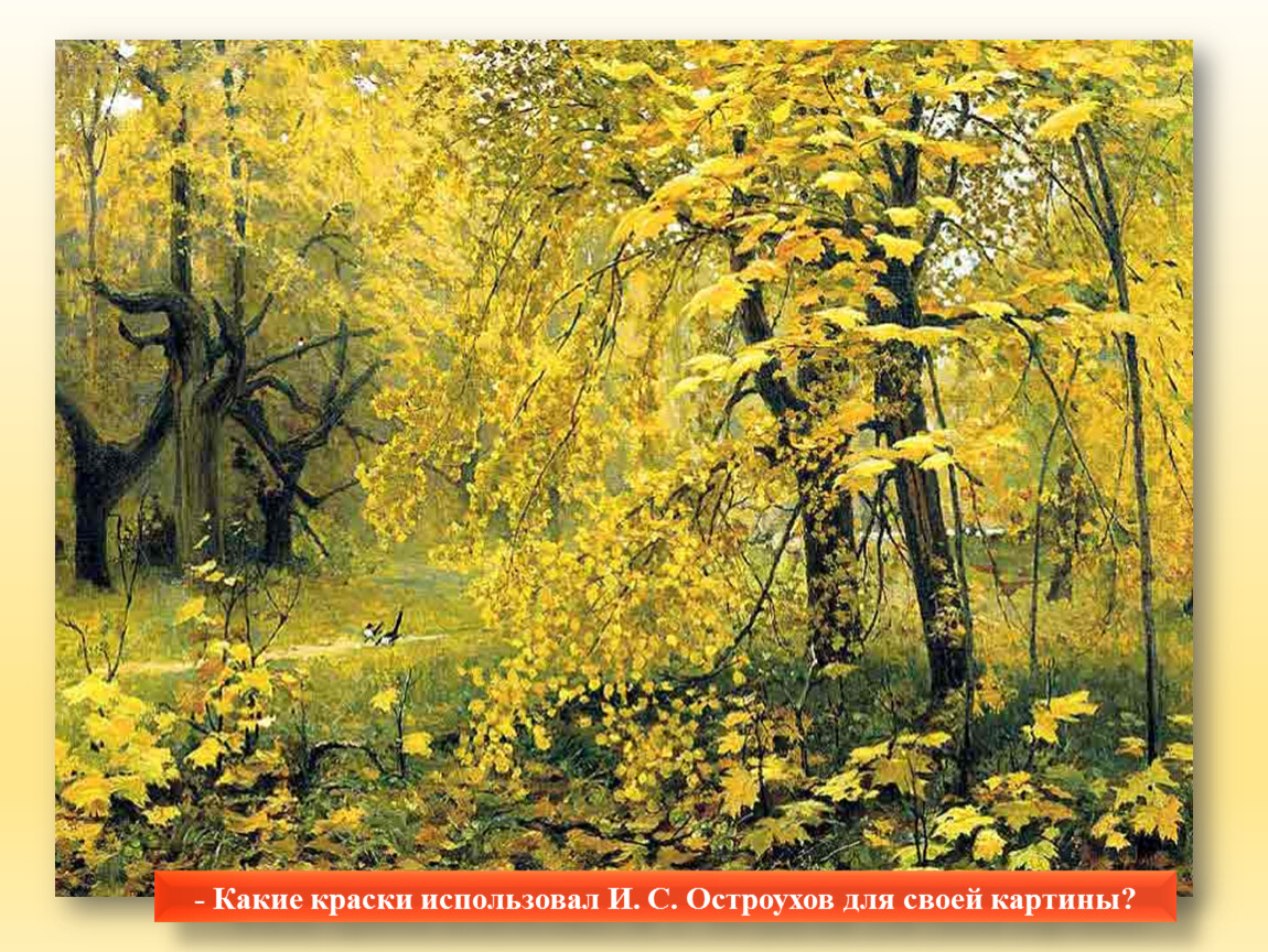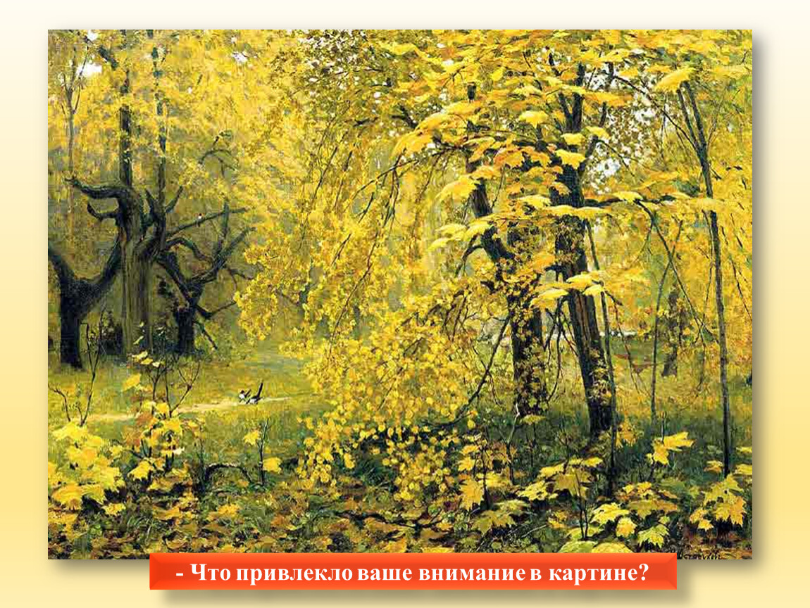 Перед нами картина И.С. Остроухова «Золотая осень». Яркими красками изобразил художник осеннюю лесную поляну. Вокруг царит тишина. Лишь на узкой тропинке болтают о чём-то сороки.
