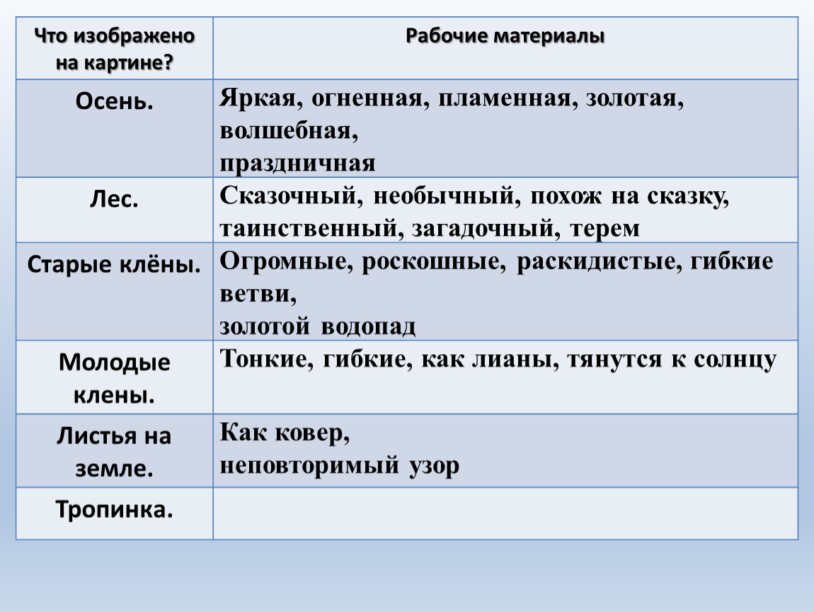 Тропинка. | Ее обступили деревья, чуть заметно вьется, устлана опавшими листьями |