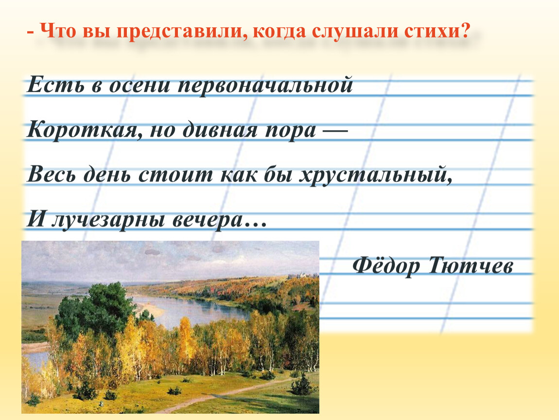 Есть в осени первоначальнойКороткая, но дивная пора —Весь день стоит как бы хрустальный,И лучезарны вечера…