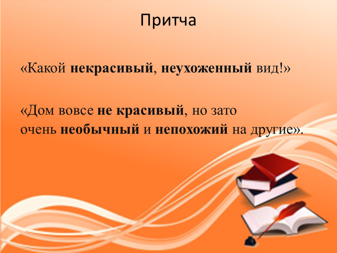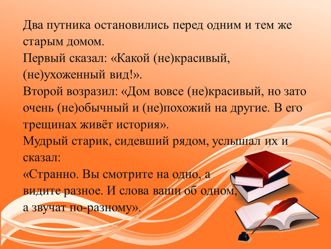 Два путника остановились перед одним и тем же старым домом.Первый сказал: «Какой (не)красивый, (не)ухоженный вид!».Второй возразил: «Дом вовсе (не)красивый, но зато очень (не)обычный и (не)похожий на другие. В его трещинах живёт история».Мудрый старик, сидевший рядом, услышал их и сказал:«Странно. Вы смотрите на одно, а