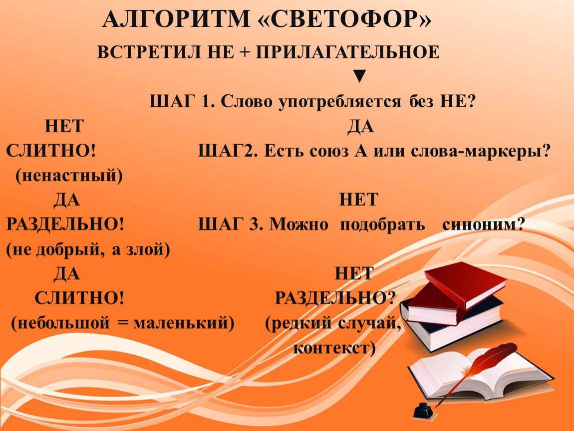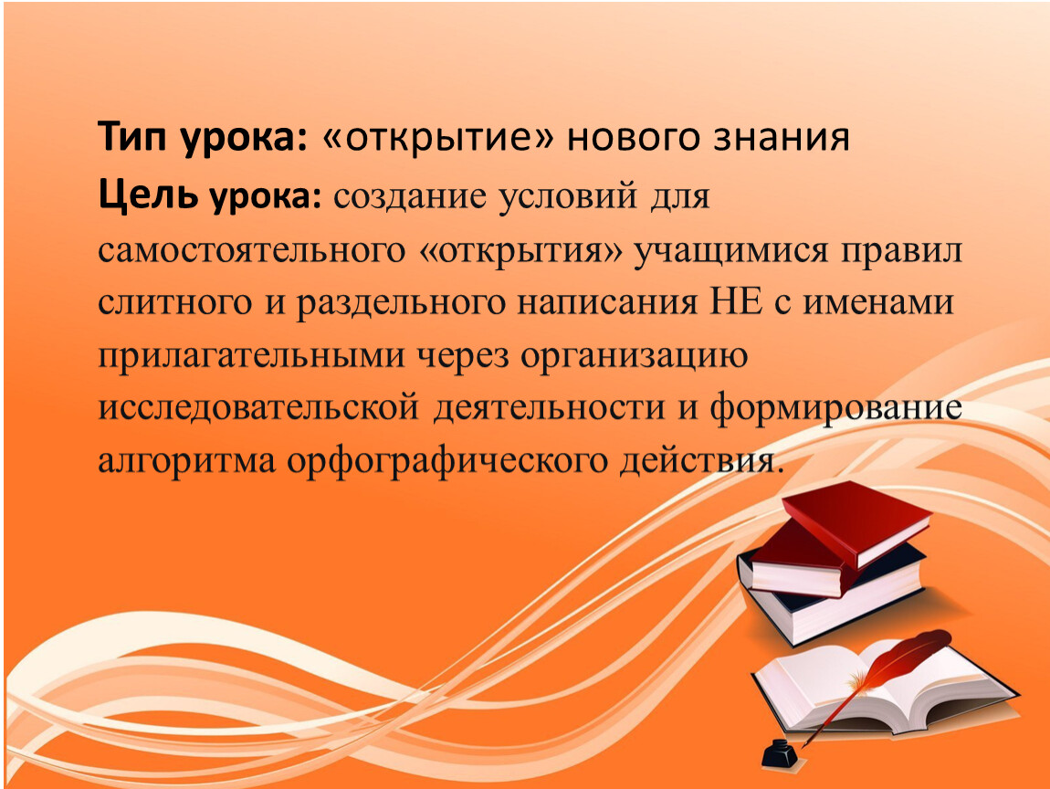 Цель урока: создание условий для самостоятельного «открытия» учащимися правил слитного и раздельного написания НЕ с именами прилагательными через организацию исследовательской деятельности и формирование алгоритма орфографического действия.