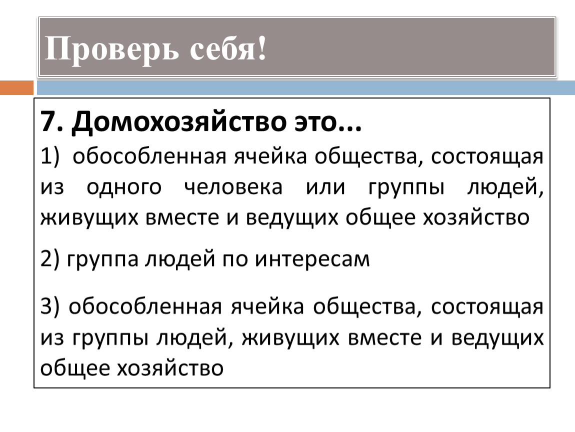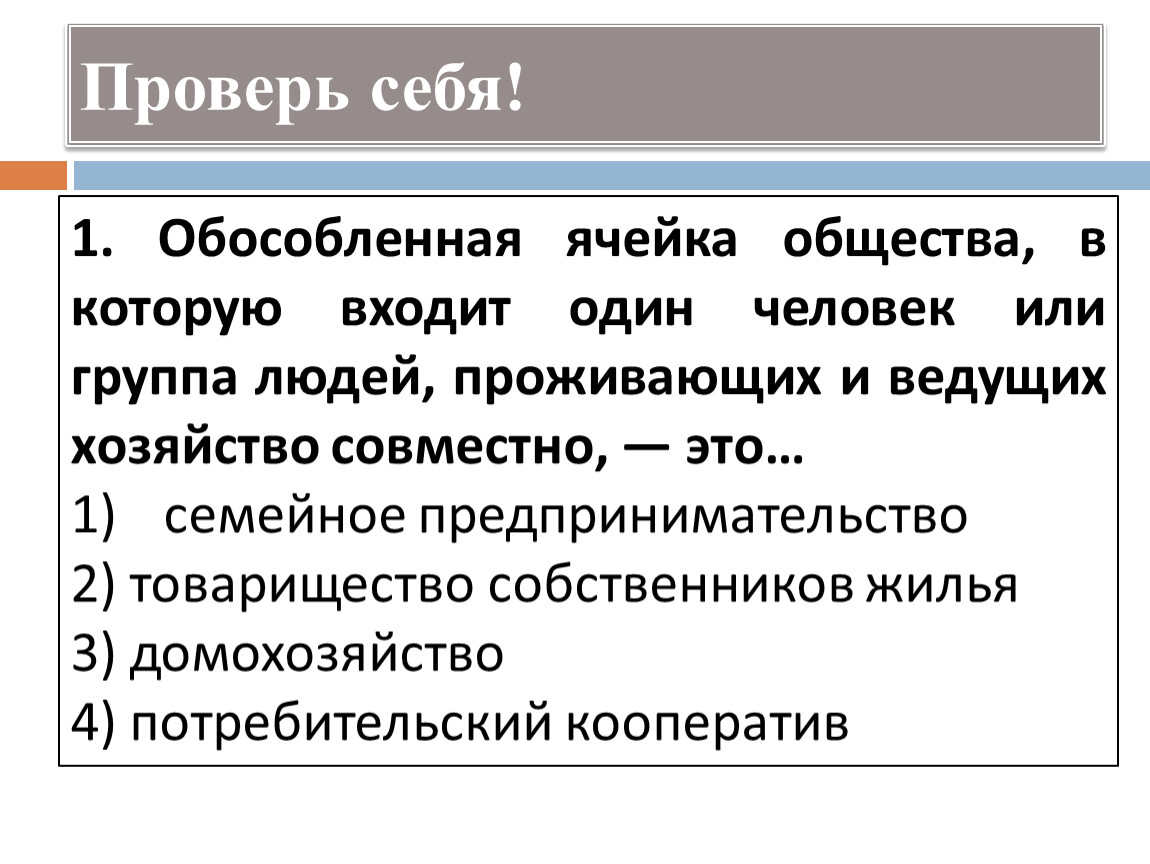 1. Обособленная ячейка общества, в которую входит один человек или группа людей, проживающих и ведущих хозяйство совместно, — это…