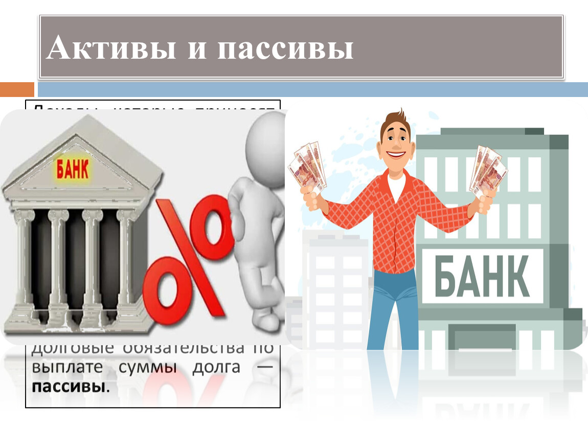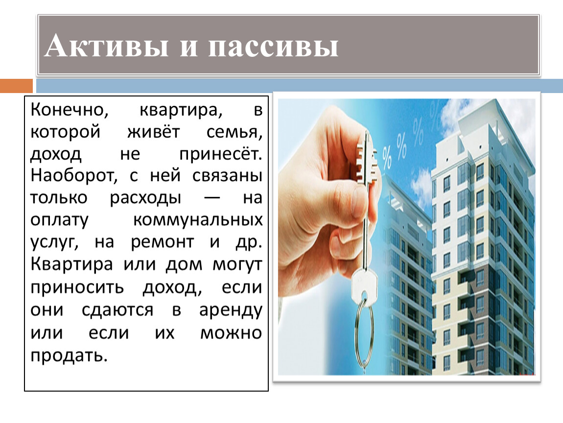 Доходы, которые приносят активы, связаны с расходами. Допустим, перед тем как сдать квартиру в аренду, надо сделать ремонт. Это требует определённых затрат, и вместо того, чтобы долгое время откладывать деньги, можно взять их в долг или взаймы. В этом случае у семьи возникают долговые обязательства по выплате суммы долга — пассивы.