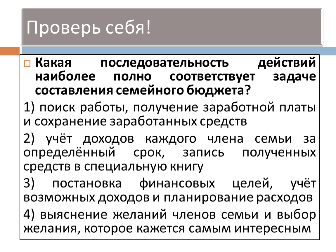 Какая последовательность действий наиболее полно соответствует задаче составления семейного бюджета?