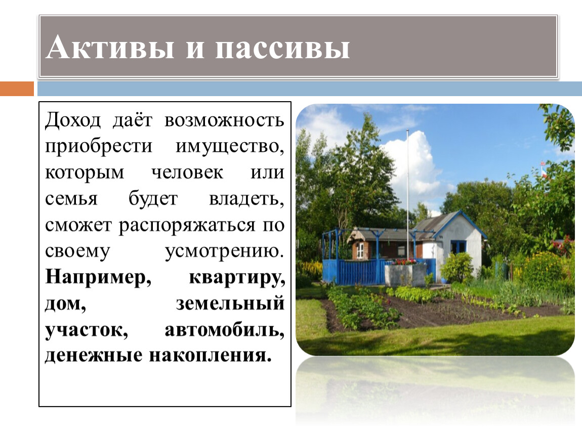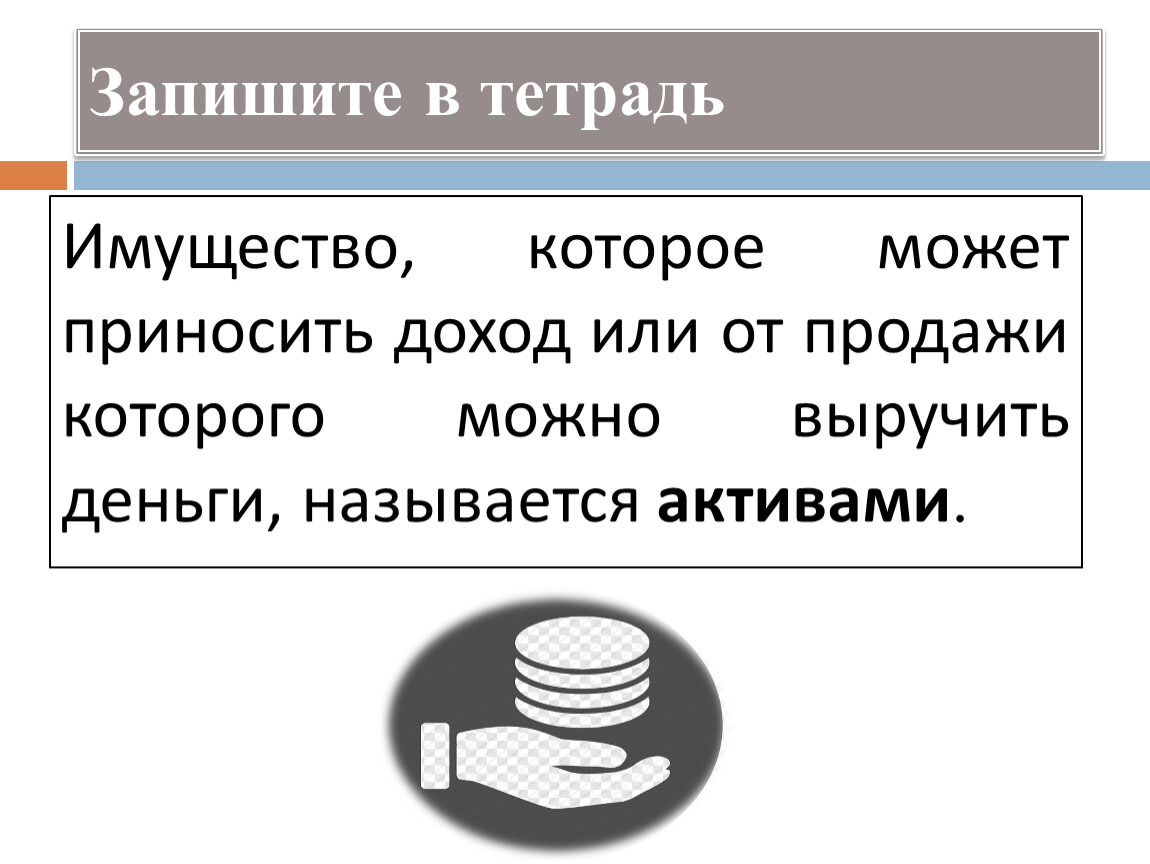 Имущество, которое может приносить доход или от продажи которого можно выручить деньги, называется активами.