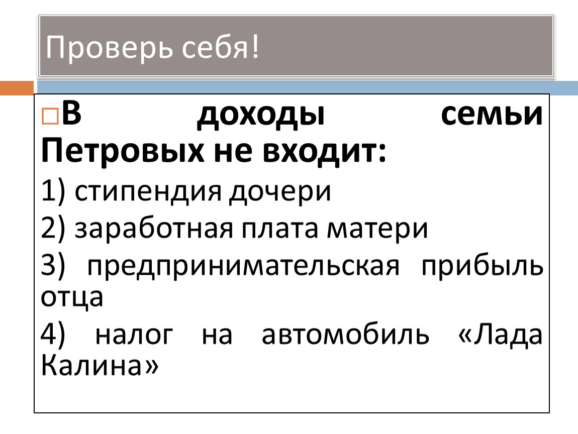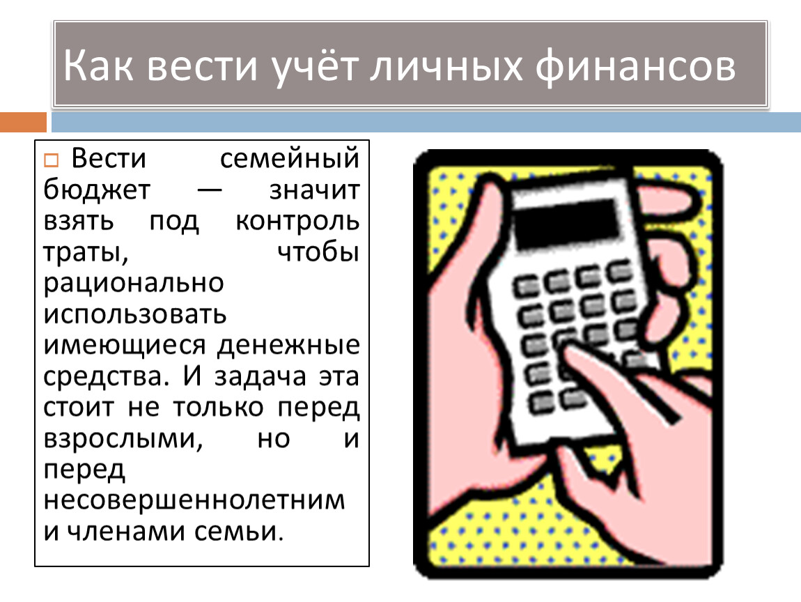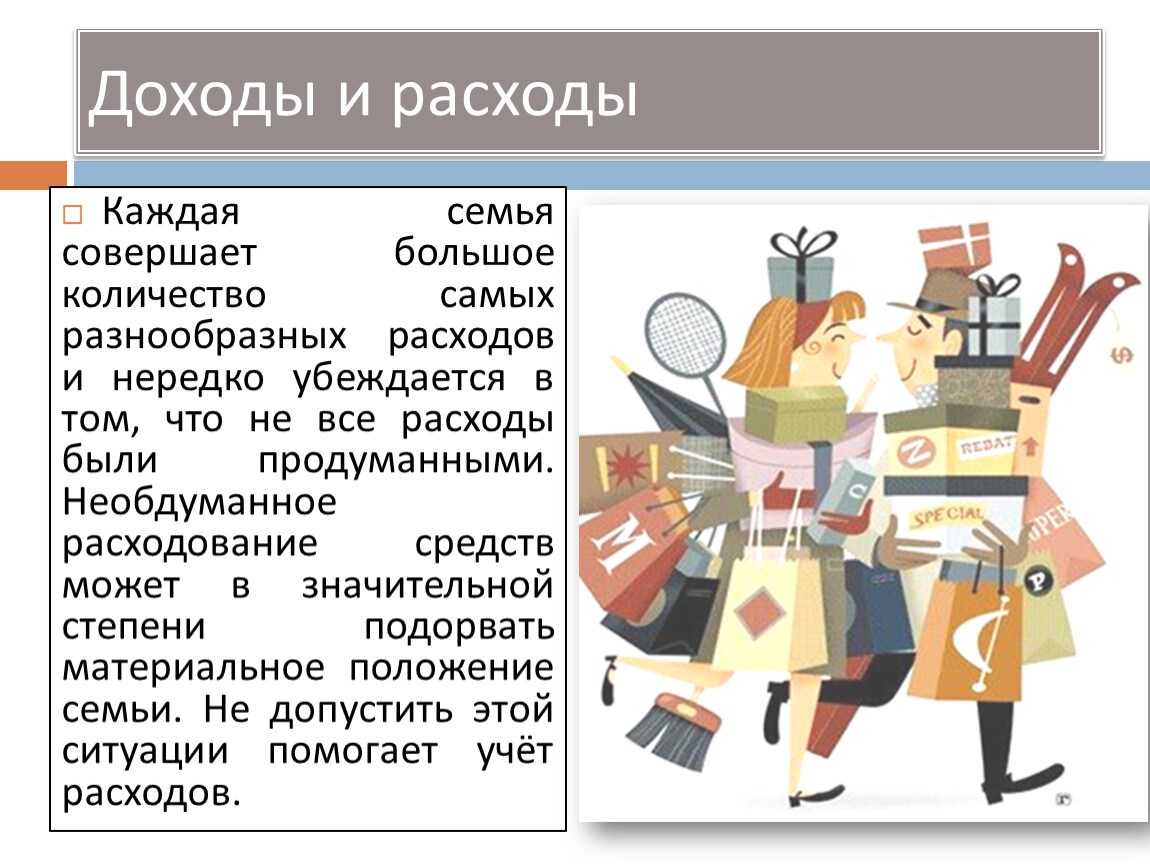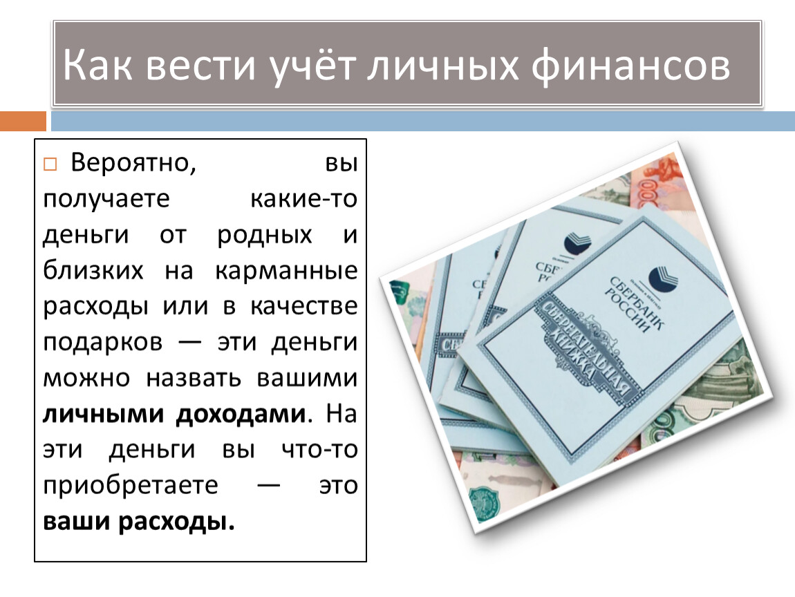 Вероятно, вы получаете какие-то деньги от родных и близких на карманные расходы или в качестве подарков — эти деньги можно назвать вашими личными доходами. На эти деньги вы что-то приобретаете — это ваши расходы.