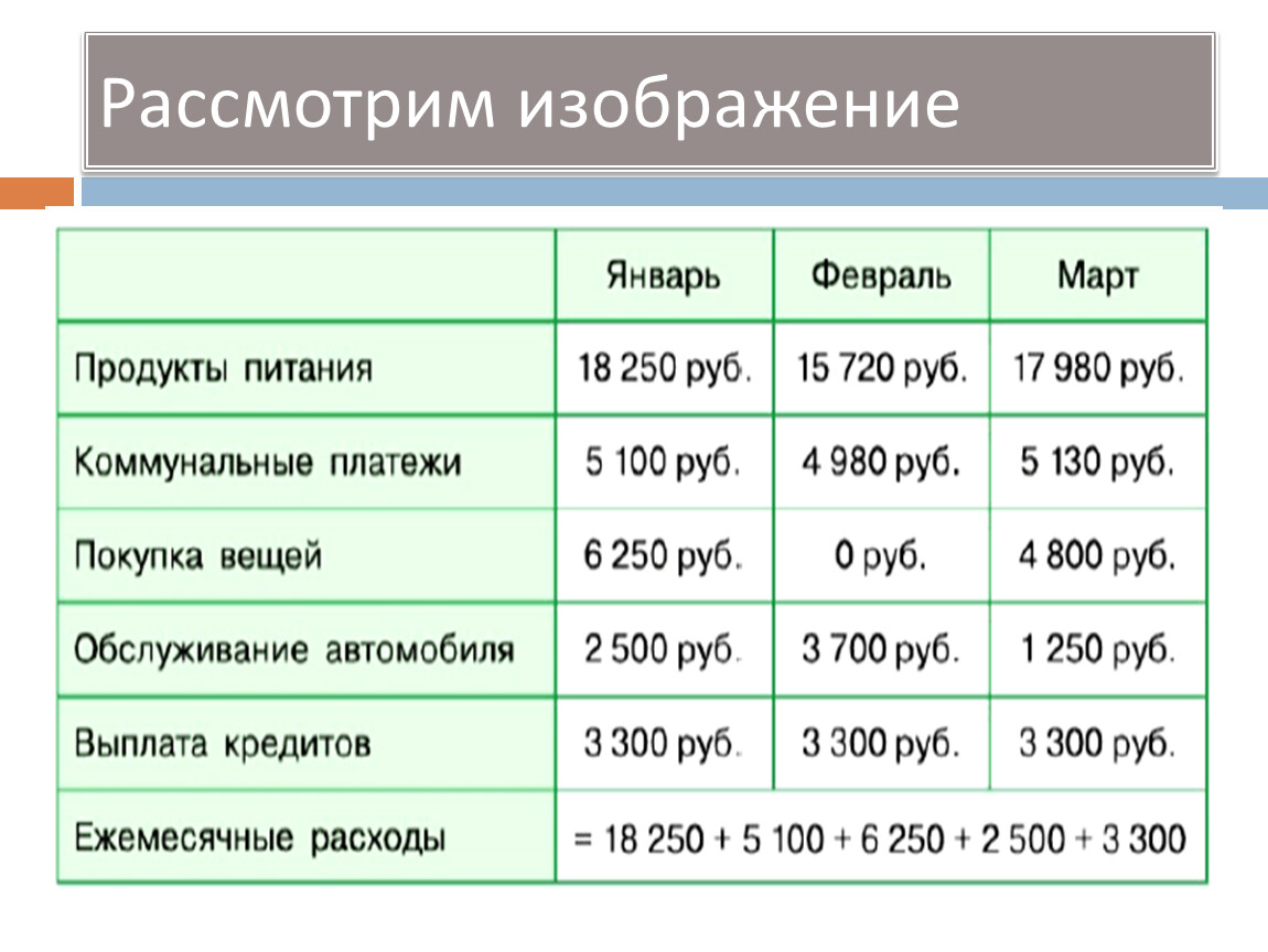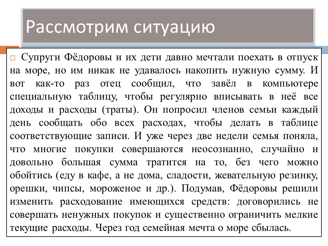 Супруги Фёдоровы и их дети давно мечтали поехать в отпуск на море, но им никак не удавалось накопить нужную сумму. И вот как-то раз отец сообщил, что завёл в компьютере специальную таблицу, чтобы регулярно вписывать в неё все доходы и расходы (траты). Он попросил членов семьи каждый день сообщать обо всех расходах, чтобы делать в таблице соответствующие записи. И уже через две недели семья поняла, что многие покупки совершаются неосознанно, случайно и довольно большая сумма тратится на то, без чего можно обойтись (еду в кафе, а не дома, сладости, жевательную резинку, орешки, чипсы, мороженое и др.). Подумав, Фёдоровы решили изменить расходование имеющихся средств: договорились не совершать ненужных покупок и существенно ограничить мелкие текущие расходы. Через год семейная мечта о море сбылась.