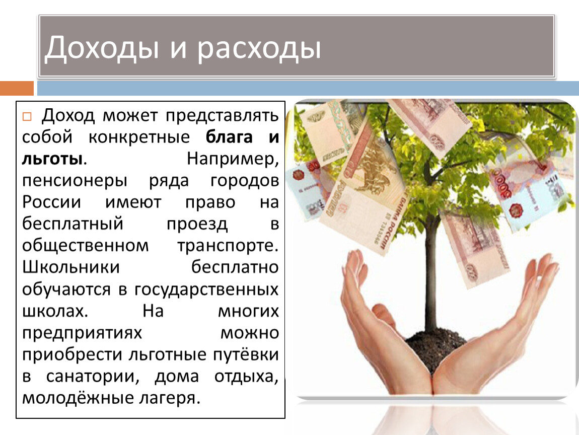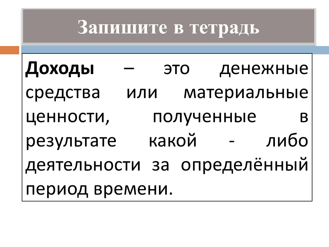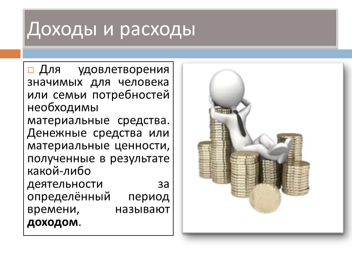 Для удовлетворения значимых для человека или семьи потребностей необходимы материальные средства. Денежные средства или материальные ценности, полученные в результате какой-либо деятельности за определённый период времени, называют доходом.