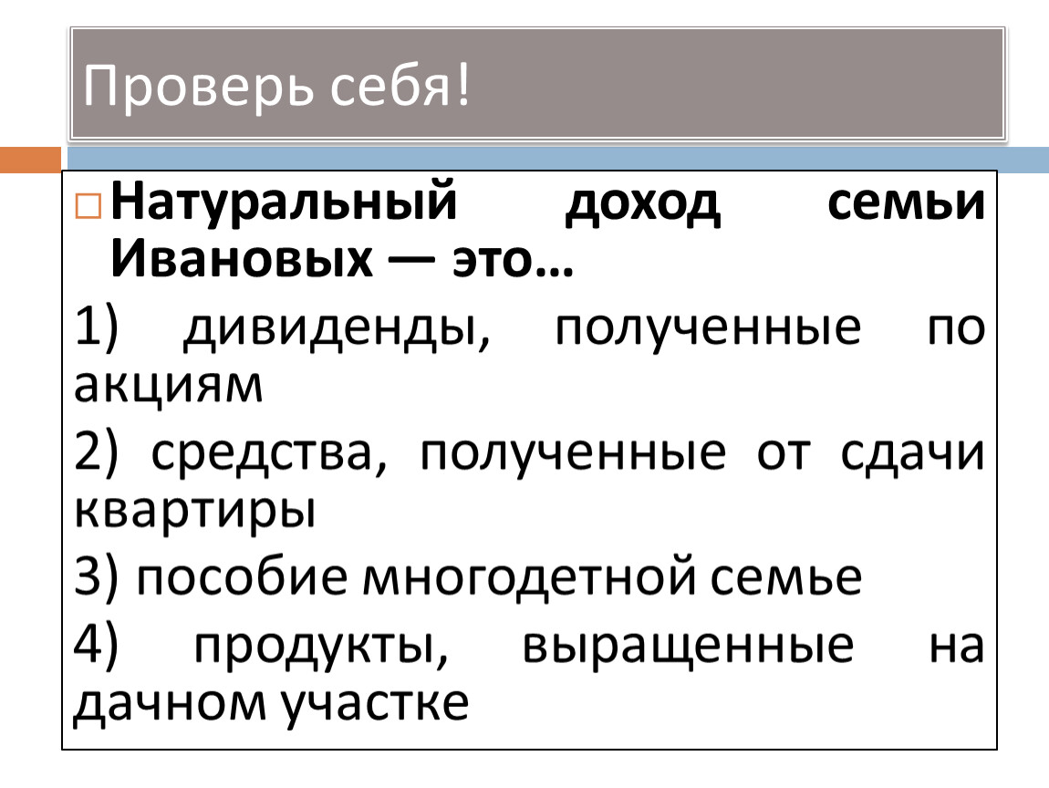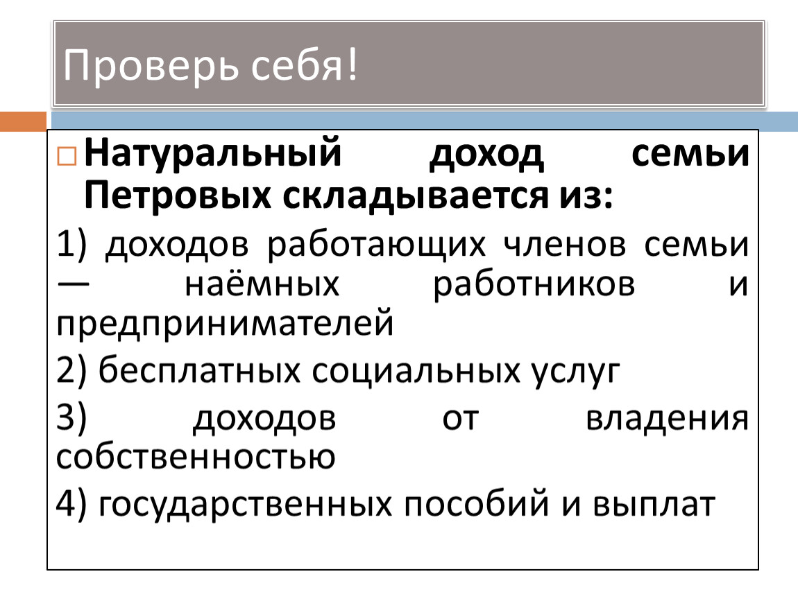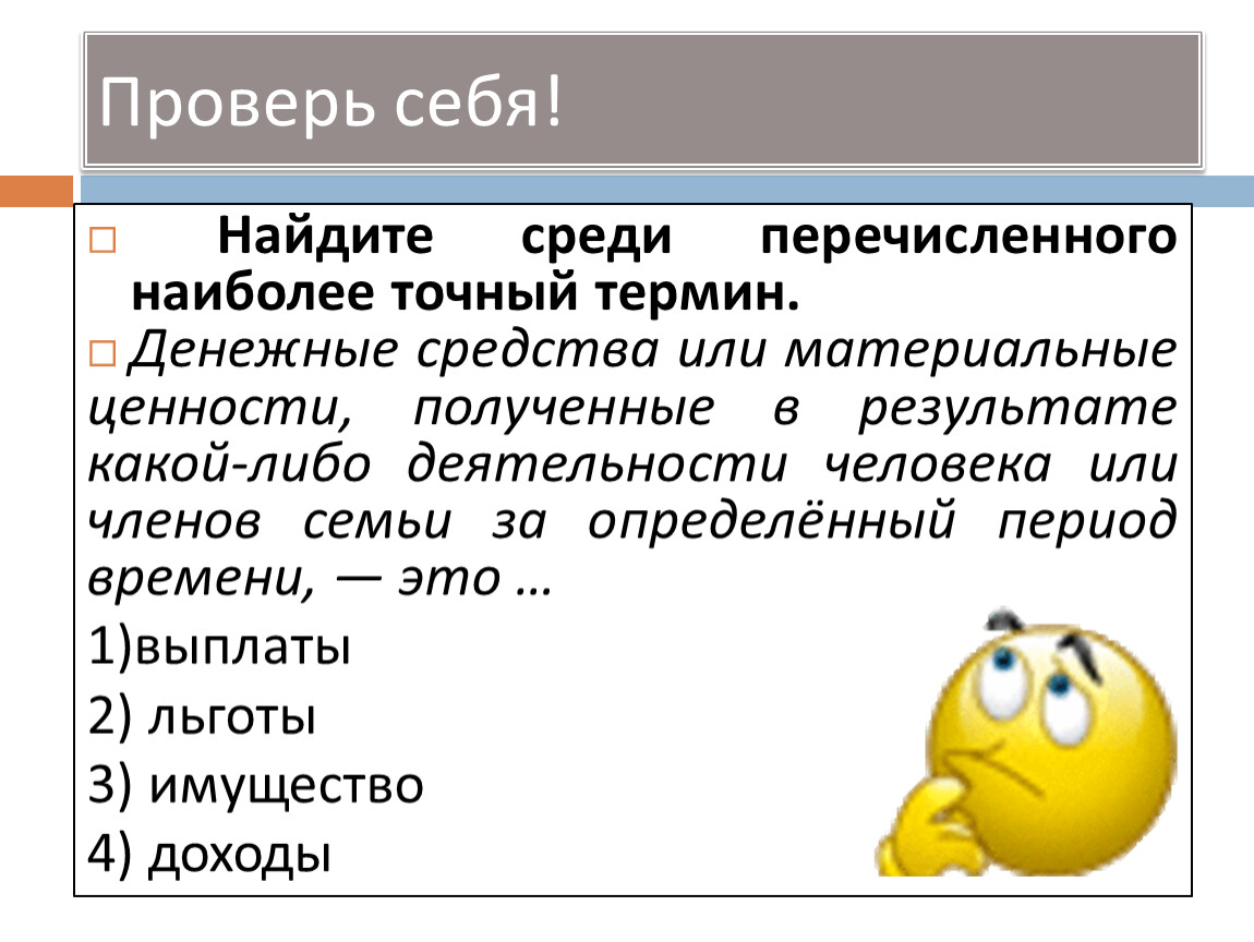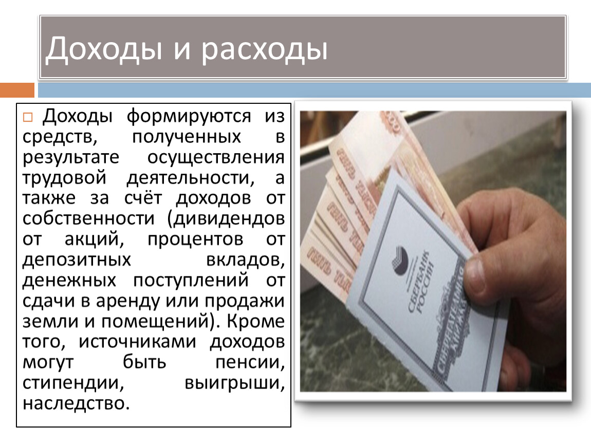 Для удовлетворения значимых для человека или семьи потребностей необходимы материальные средства. Денежные средства или материальные ценности, полученные в результате какой-либо деятельности за определённый период времени, называют доходом.