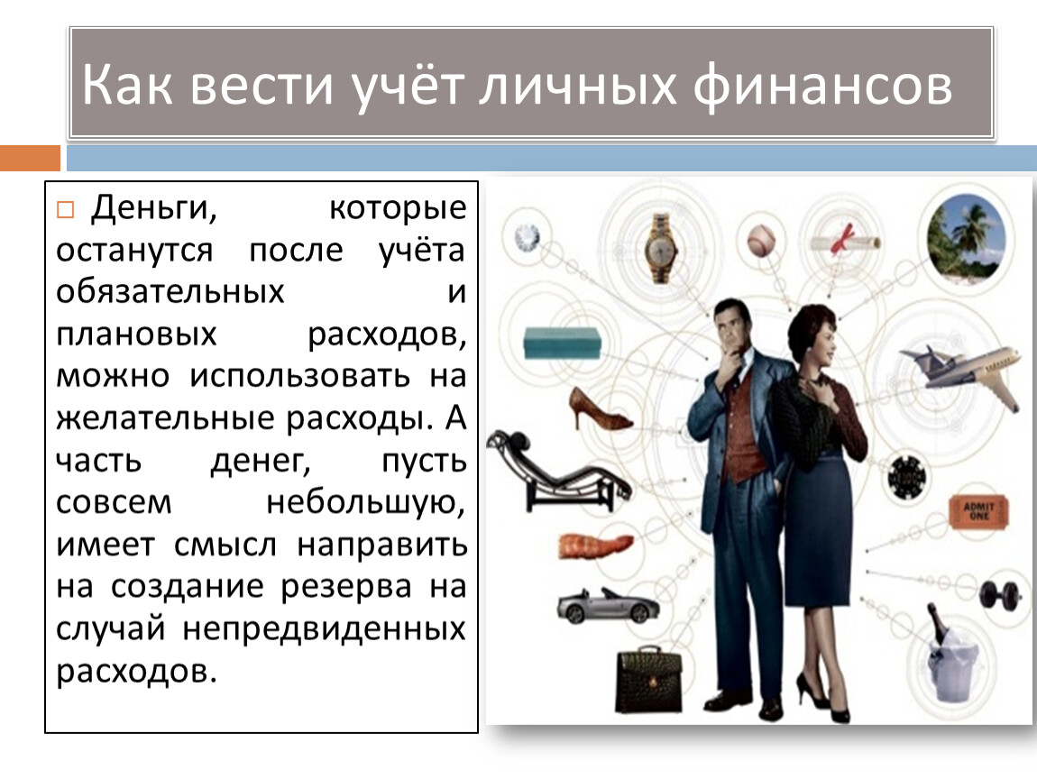 Деньги, которые останутся после учёта обязательных и плановых расходов, можно использовать на желательные расходы. А часть денег, пусть совсем небольшую, имеет смысл направить на создание резерва на случай непредвиденных расходов.