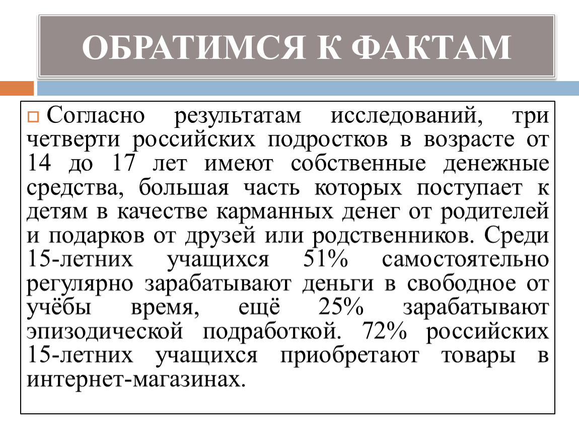 Согласно результатам исследований, три четверти российских подростков в возрасте от 14 до 17 лет имеют собственные денежные средства, большая часть которых поступает к детям в качестве карманных денег от родителей и подарков от друзей или родственников. Среди 15-летних учащихся 51% самостоятельно регулярно зарабатывают деньги в свободное от учёбы время, ещё 25% зарабатывают эпизодической подработкой. 72% российских 15-летних учащихся приобретают товары в интернет-магазинах.