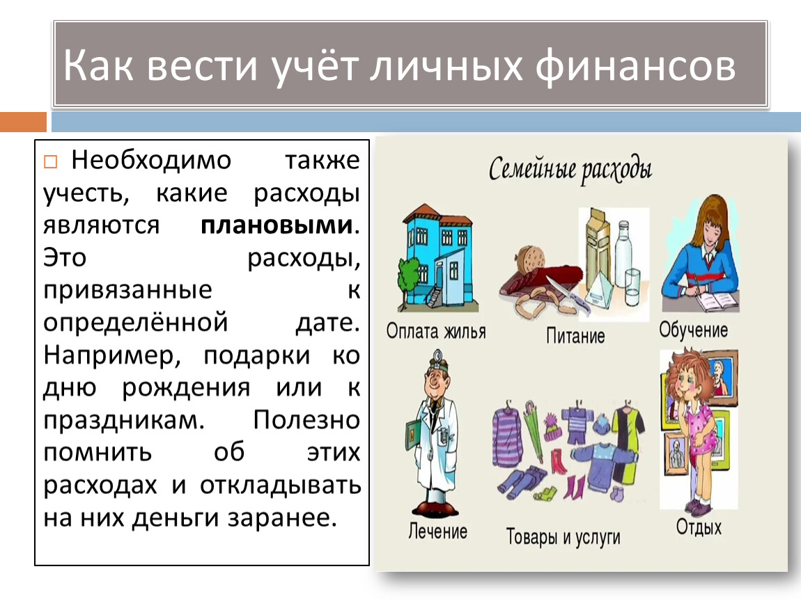 Необходимо также учесть, какие расходы являются плановыми. Это расходы, привязанные к определённой дате. Например, подарки ко дню рождения или к праздникам. Полезно помнить об этих расходах и откладывать на них деньги заранее.