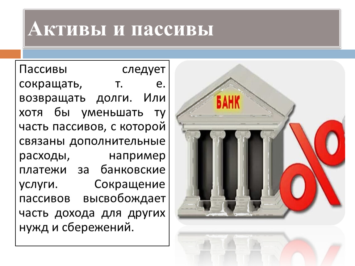 Пассивы следует сокращать, т. е. возвращать долги. Или хотя бы уменьшать ту часть пассивов, с которой связаны дополнительные расходы, например платежи за банковские услуги. Сокращение пассивов высвобождает часть дохода для других нужд и сбережений.