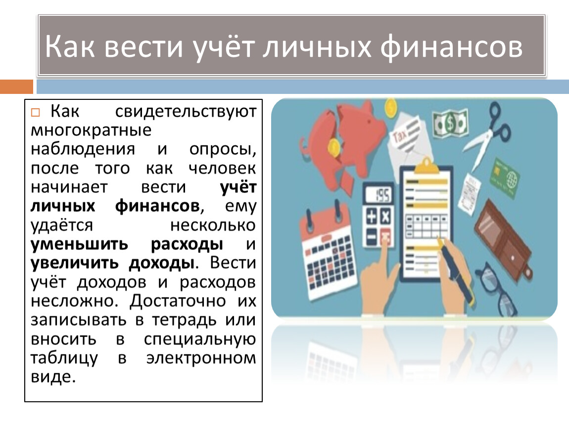 Как свидетельствуют многократные наблюдения и опросы, после того как человек начинает вести учёт личных финансов, ему удаётся несколько уменьшить расходы и увеличить доходы. Вести учёт доходов и расходов несложно. Достаточно их записывать в тетрадь или вносить в специальную таблицу в электронном виде.