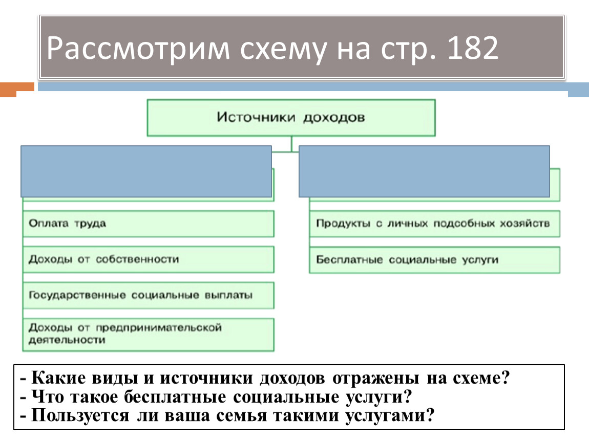 - Какие виды и источники доходов отражены на схеме? - Что такое бесплатные социальные услуги? - Пользуется ли ваша семья такими услугами?