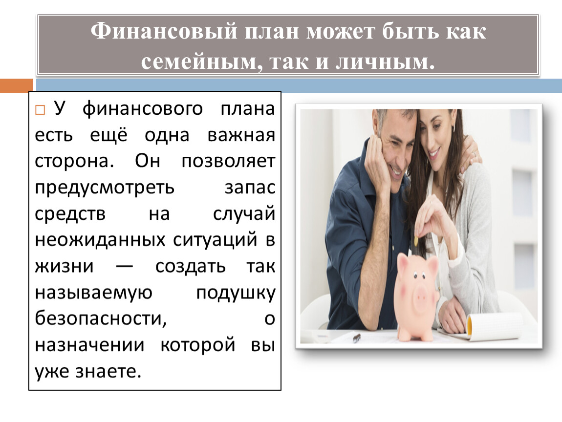 У финансового плана есть ещё одна важная сторона. Он позволяет предусмотреть запас средств на случай неожиданных ситуаций в жизни — создать так называемую подушку безопасности, о назначении которой вы уже знаете.