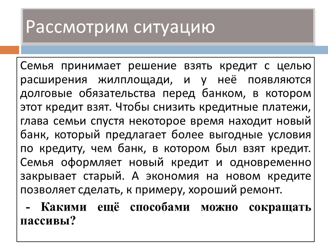 Семья принимает решение взять кредит с целью расширения жилплощади, и у неё появляются долговые обязательства перед банком, в котором этот кредит взят. Чтобы снизить кредитные платежи, глава семьи спустя некоторое время находит новый банк, который предлагает более выгодные условия по кредиту, чем банк, в котором был взят кредит. Семья оформляет новый кредит и одновременно закрывает старый. А экономия на новом кредите позволяет сделать, к примеру, хороший ремонт.