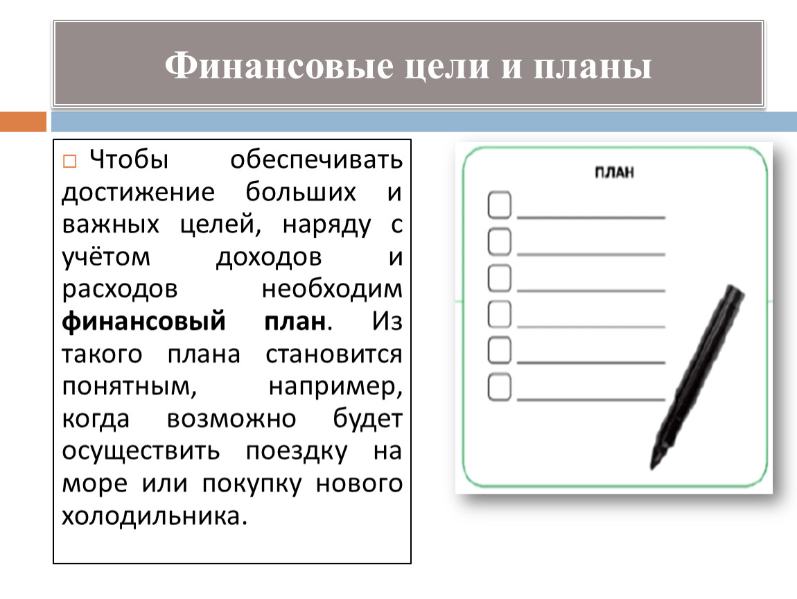 Чтобы обеспечивать достижение больших и важных целей, наряду с учётом доходов и расходов необходим финансовый план. Из такого плана становится понятным, например, когда возможно будет осуществить поездку на море или покупку нового холодильника.
