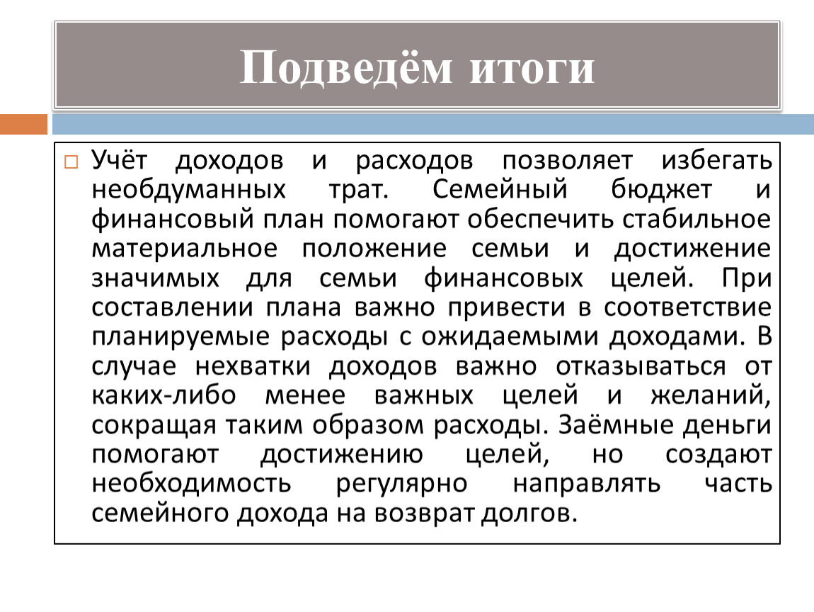 Учёт доходов и расходов позволяет избегать необдуманных трат. Семейный бюджет и финансовый план помогают обеспечить стабильное материальное положение семьи и достижение значимых для семьи финансовых целей. При составлении плана важно привести в соответствие планируемые расходы с ожидаемыми доходами. В случае нехватки доходов важно отказываться от каких-либо менее важных целей и желаний, сокращая таким образом расходы. Заёмные деньги помогают достижению целей, но создают необходимость регулярно направлять часть семейного дохода на возврат долгов.