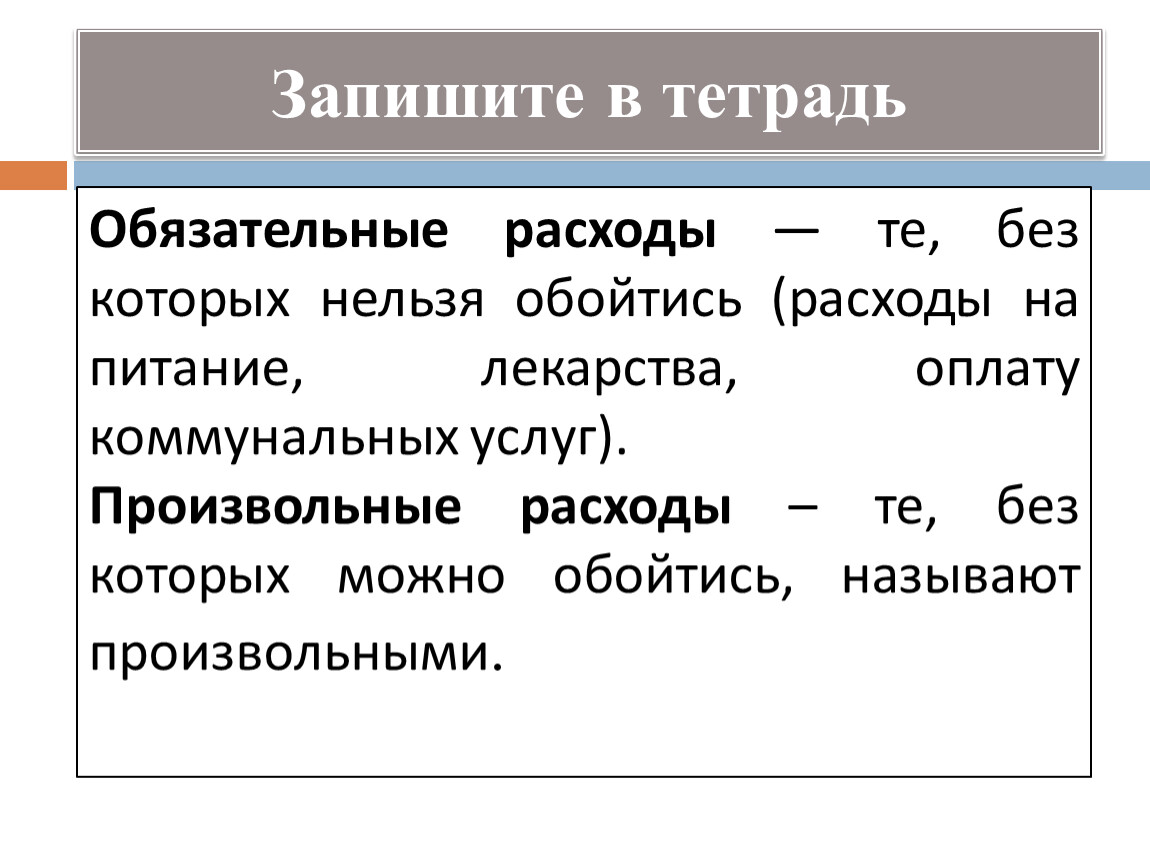 Обязательные расходы — те, без которых нельзя обойтись (расходы на питание, лекарства, оплату коммунальных услуг).