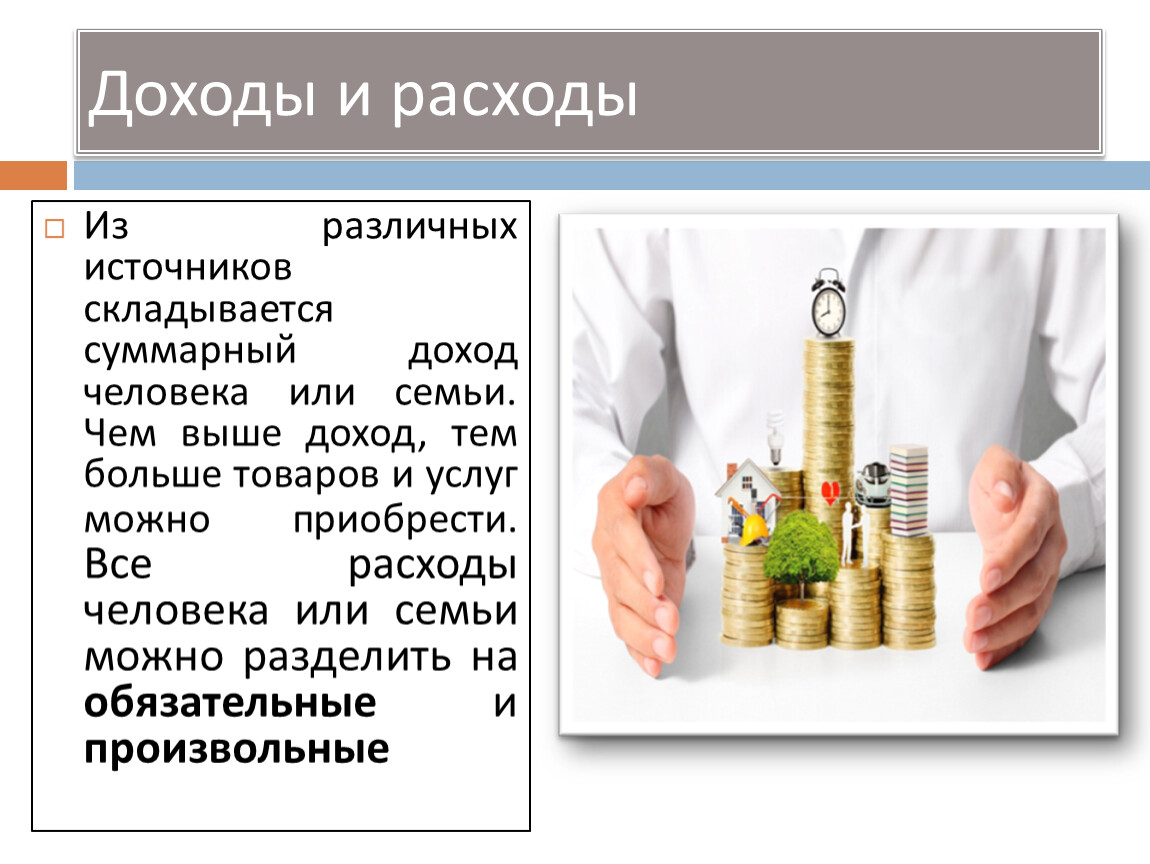 Из различных источников складывается суммарный доход человека или семьи. Чем выше доход, тем больше товаров и услуг можно приобрести. Все расходы человека или семьи можно разделить на обязательные и произвольные