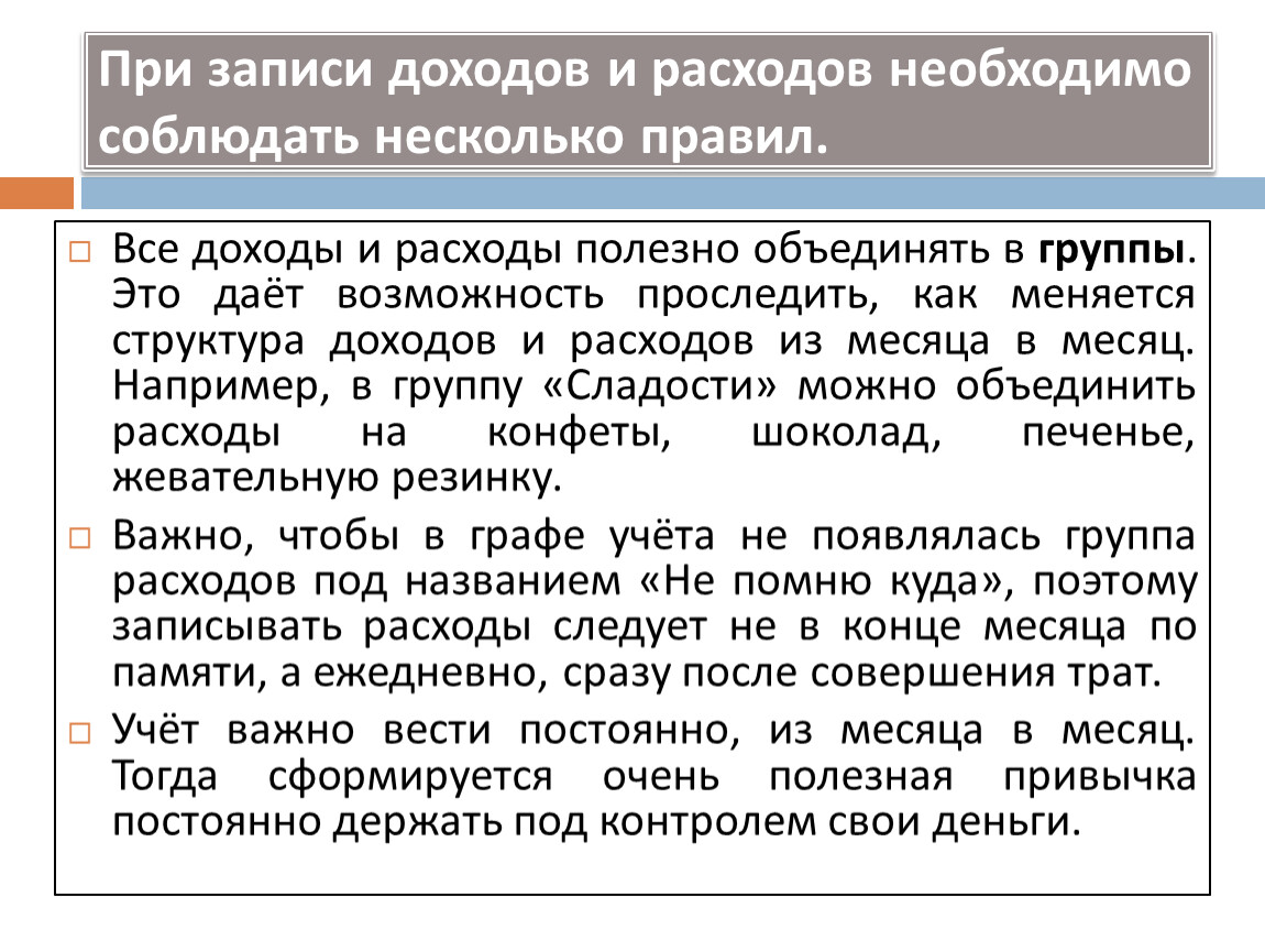 При записи доходов и расходов необходимо соблюдать несколько правил.