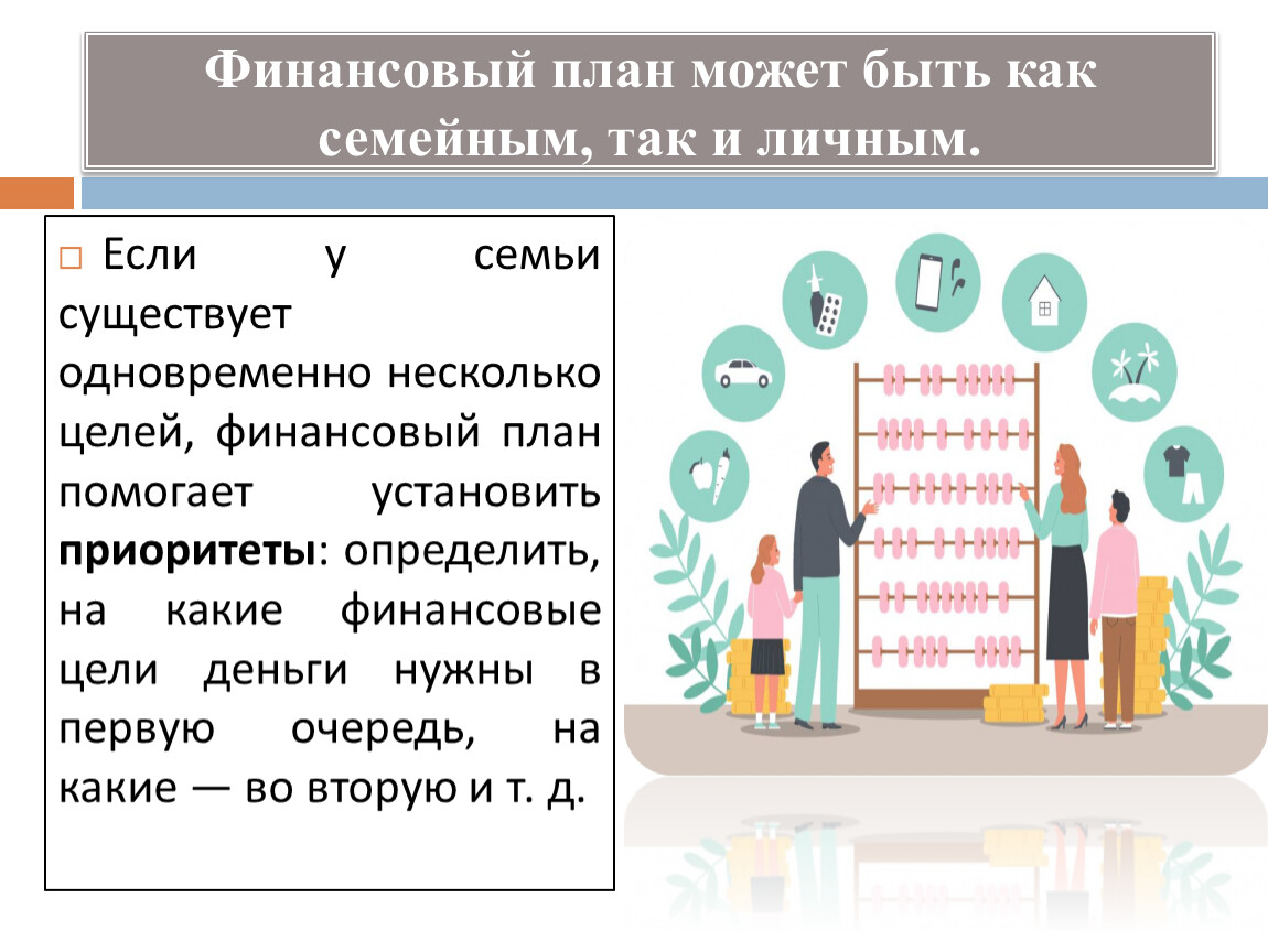 Если у семьи существует одновременно несколько целей, финансовый план помогает установить приоритеты: определить, на какие финансовые цели деньги нужны в первую очередь, на какие — во вторую и т. д.