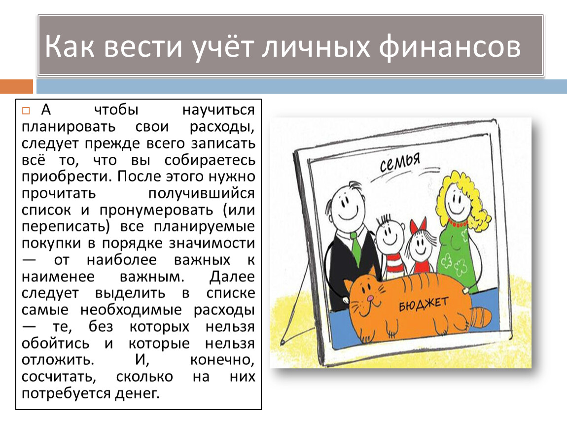 Каждая семья совершает большое количество самых разнообразных расходов и нередко убеждается в том, что не все расходы были продуманными. Необдуманное расходование средств может в значительной степени подорвать материальное положение семьи. Не допустить этой ситуации помогает учёт расходов.